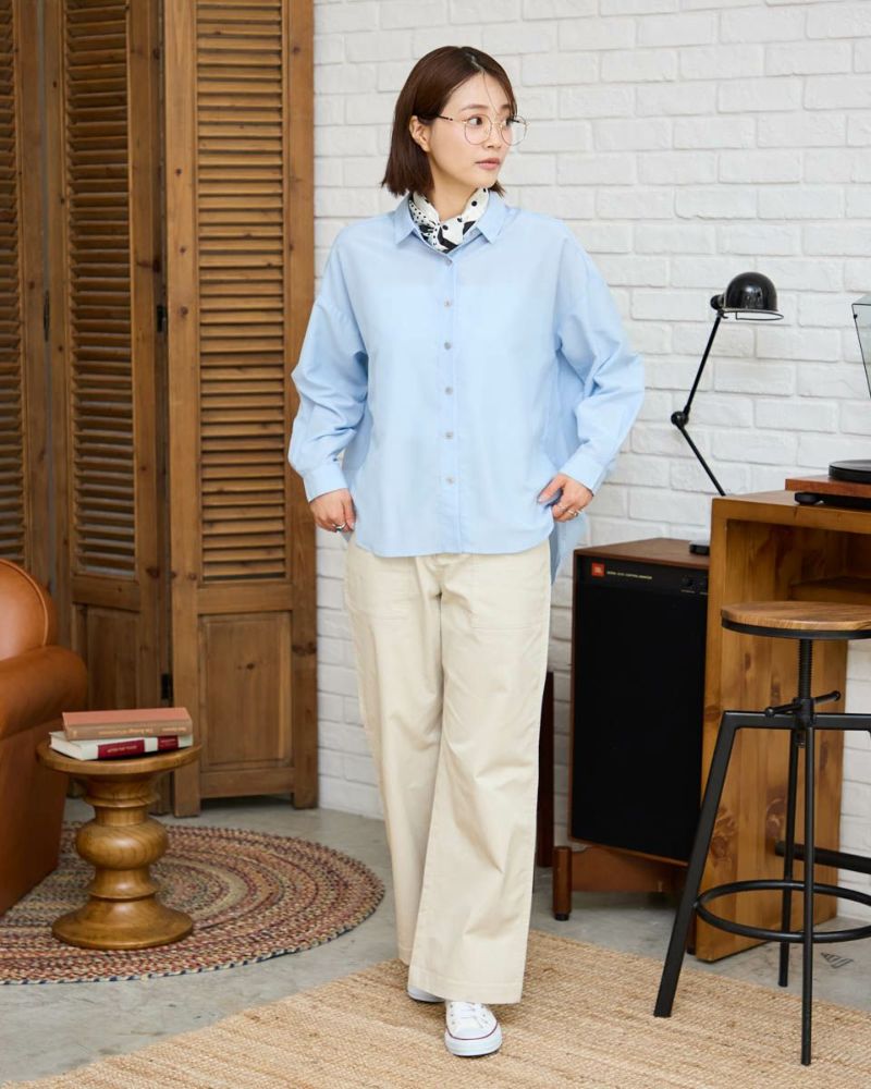 軽やかなブルーとグリーンの2色で展開する、爽やかなUVカットシャツです。紫外線対策とスタイルアップを両立させたアイテム。UVカット機能付きのサラリとした肌触りの素材を使用し、日差しの強い日でも快適に。屋外でもしっかりと肌を守ります。裾はさりげなく個性を演出する変形シルエット。動きのあるラインが抜け感をプラスし、どんなボトムスとも好相性です。 モデル身長: 167 cm 着用サイズ: M サイズ Golden Bear Ladies' ブラウス (Ladies') 【着用アイテム】467R7401 タンクトップ 467R7701 ベイカーパンツ 467R8011 トートバッグ
