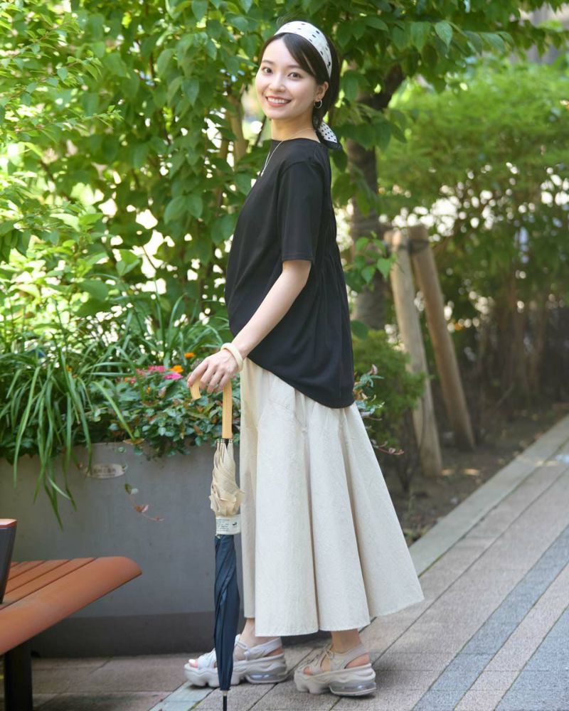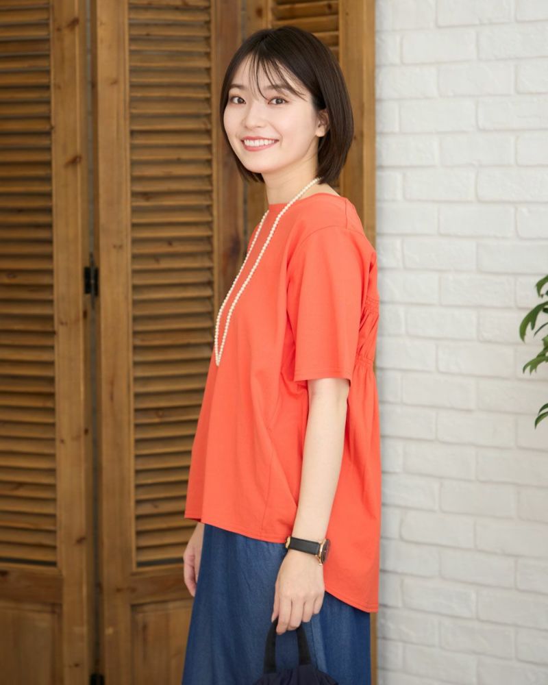 接触冷感、UVカットの機能が嬉しいトリコット素材のTシャツです。シワになりにくく、洗濯後に型崩れしにくい素材でサラッとした着心地が楽しめます。前身はシンプルですが、後身は分量があるのがポイントのデザインTシャツです。 モデル身長: 162 cm 着用サイズ: M サイズ Golden Bear Ladies' カットソー (Ladies') 【着用アイテム】467R4703 スカート 467R7702 ガウチョパンツ 467R7703 クロップドパンツ