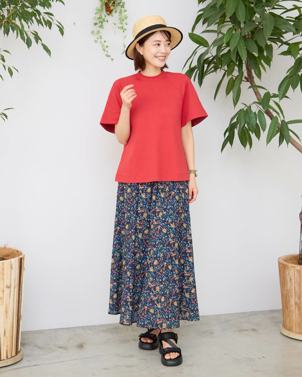 たてに波のような細かい畝の有る素材にプリントしたスカートです。表情のある素材で透け感が有り、濃色でも重さを感じさせないように仕上げました。裏地付きです。ウエストはオールゴムの開き無しで、ヒップライン辺りから、裾に向けフレアー分量を増やしたシルエットです。 モデル身長: 167 cm 着用サイズ: M サイズ Golden Bear WOMEN ボトムス (WOMEN) 【着用アイテム】468R7460 ハイネックプルオーバー 467R7002 ツバ広ハット
