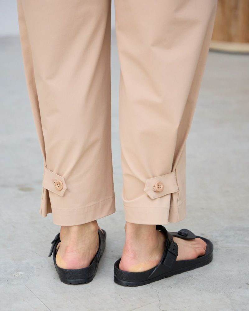 軽くて横方向に伸びる素材を使用したカーゴパンツです。全体的にゆったりめのシルエットです。両脇裾に裾巾を調節できるタブが有り、二通りのシルエットを着用頂けます。後ろウエストはギャザーゴム仕様です。色はベージュと肌馴染みの良いピンクの2色展開です。 モデル身長: 167 cm 着用サイズ: 64 サイズ Golden Bear Ladies' ボトムス (Ladies') 【着用アイテム】467R7311 袖デザインブラウス 467R7312 シャドーチェックブラウス 468R7452 2wayカーディガン