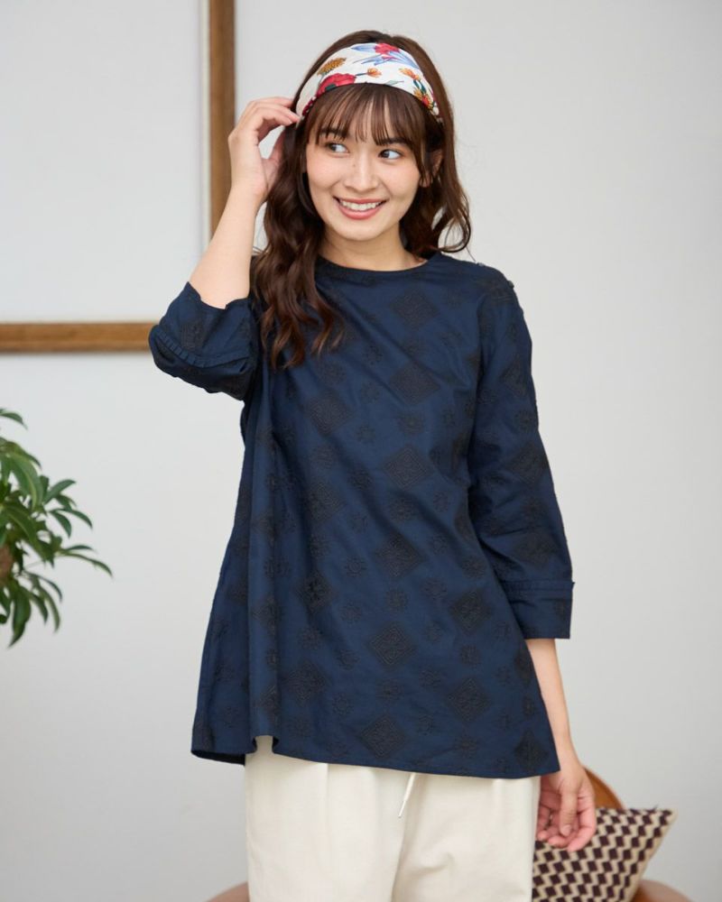 プリントでは表現できない刺繍ならではの高級感のあるブラウスです。ナチュラルなのに存在感があり1枚でコーディネートが完成する便利なアイテムです。