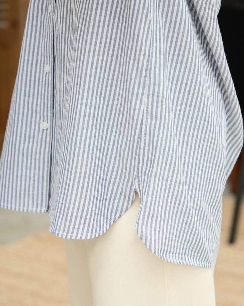 オーガニックコットン100%のふんわりとした膨らみ感が特徴のWガーゼ素材を使用したストライプ柄のシャツです。風合いが柔らかく肌触りの良い素材で一枚着としても夏の羽織物としても着用頂けます。左胸のポケットに枠くま刺繍を入れています。