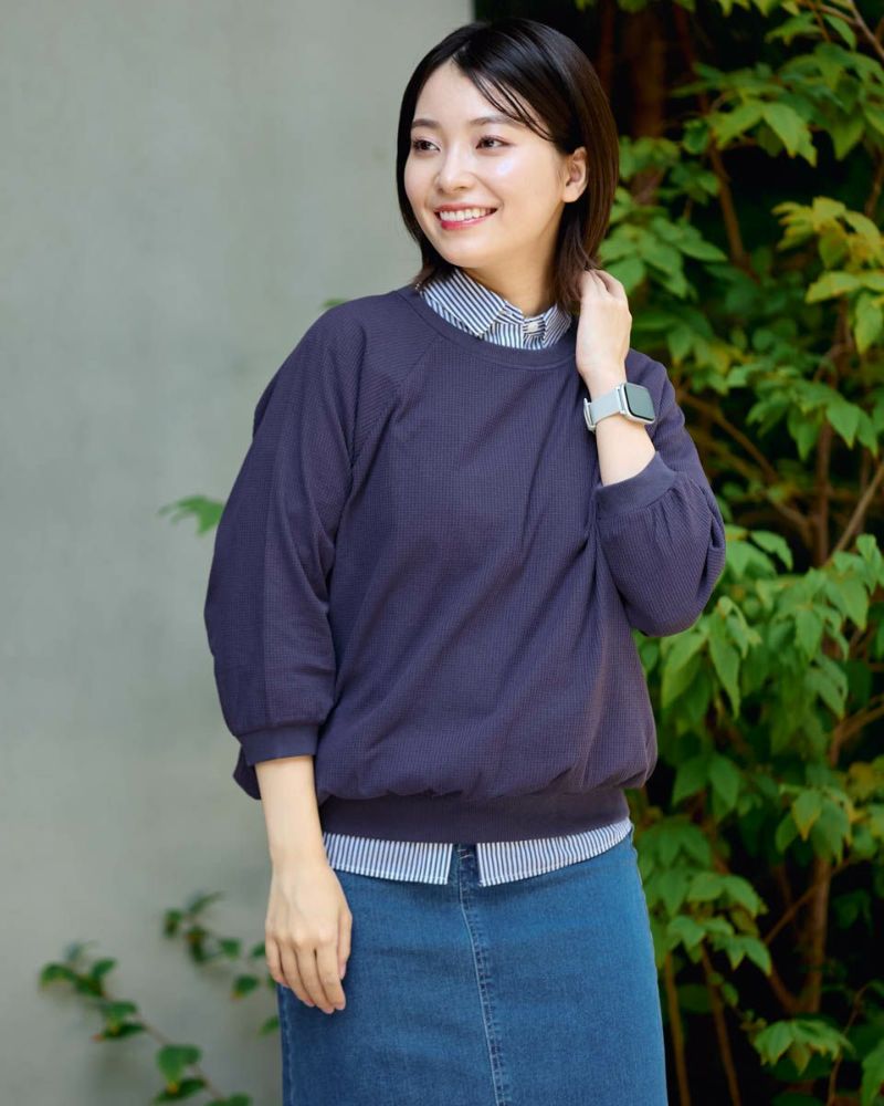 軽くてさらっとしたドライタッチのワッフル素材のTシャツ。5分袖とゆったりしたボリュームシルエットで、動きやすくリラックスした着心地です。肌離れが良く、汗ばむ季節でも快適に過ごせる一枚。 モデル身長: 162 cm 着用サイズ: M サイズ Golden Bear Ladies' カットソー (Ladies') 【着用アイテム】467RC712 デニムAラインスカート 467R8010 花柄ストール