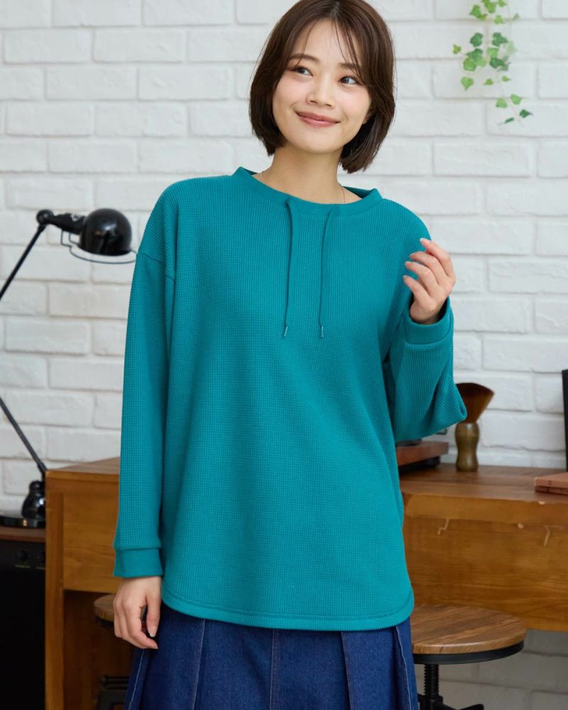 ワッフル素材のオーバーサイズトップスです。膨らみがあり、柔らかな素材です。襟の開きを調整できるスピンドルディティールがポイントです。1枚でも重ね着でも着回しやすいアイテムなので長く着用いただけます。 モデル身長: 167 cm 着用サイズ: M サイズ Golden Bear WOMEN カットソー (WOMEN) 【着用アイテム】467RD701 ストレートカーゴパンツ 468RC751 デニムスカート