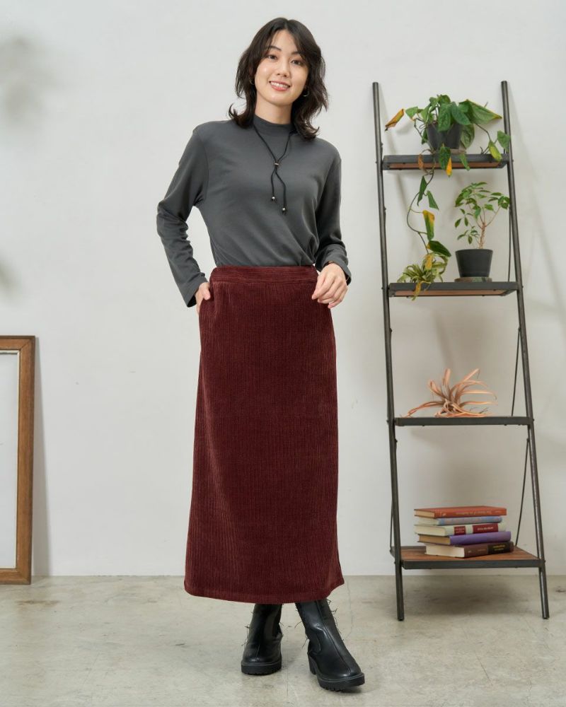 タテ方向のウネと細かい毛羽が特徴的なコーデュロイを使っています。手の平に吸い付くような触感が気持ちよく独特の光沢から生まれる陰影で、ほっこりした雰囲気が消え大人仕様のアイテムになっています。細みの台形型でコットン単体のものに比べヨコ方向にしっかり伸びるため立つ、しゃがむの動作も楽ちん。ゴム仕様のウエストは腹部が膨らまないようギャザー分量を少なく設定しています。サイドポケットや裏地も付いているためタイツとの摩擦を軽減しオフィスでの着用も◎シューズを選ばず足元のお洒落もお楽しみいただけるスカートになっています