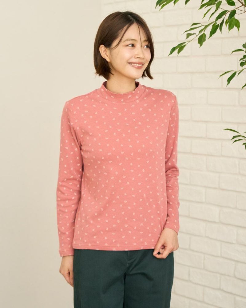 綿100%の発熱機能素材を使用したプリントハイネックTシャツ。様々なコーディネートに合わせられるようカラーをチョイスしました。