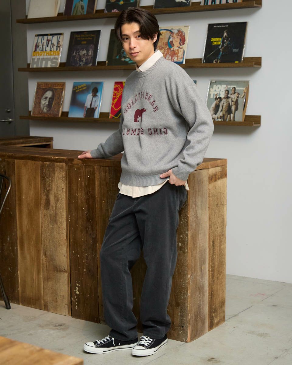 カレッジロゴスウェットをモチーフに、ロゴとアイコンのクマをニットで表現しました。王道のプレッピーコーデがおすすめです。ご家庭での手洗い洗濯が可能です。 モデル身長: 180 cm 着用サイズ: L サイズ Golden Bear MEN ニット (MEN) ウィメンズサイズはこちら 家族コーディネートアイテムはこちら 【着用アイテム】314RC230 オックスシャツ 314RE721 ストレッチコーデュロイパンツ