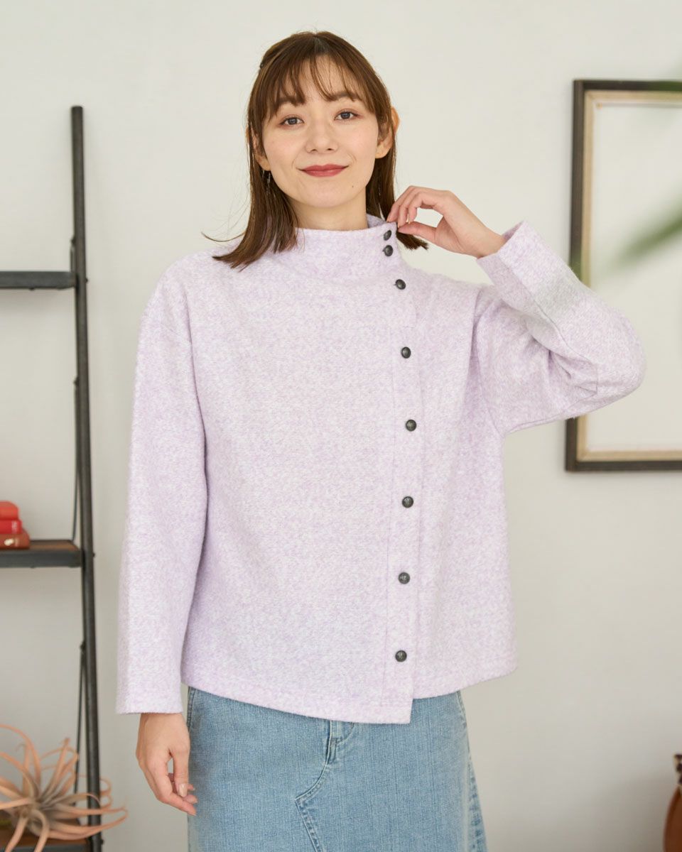 ブークレー調のジャカードを使用したボトルネックのプルオーバー。斜めに切り替えた前身とボタンデザインが印象的な一枚です。 モデル身長: 171 cm 着用サイズ: M サイズ Golden Bear WOMEN カットソー (WOMEN) 【着用アイテム】467QD710 ストレートパンツ