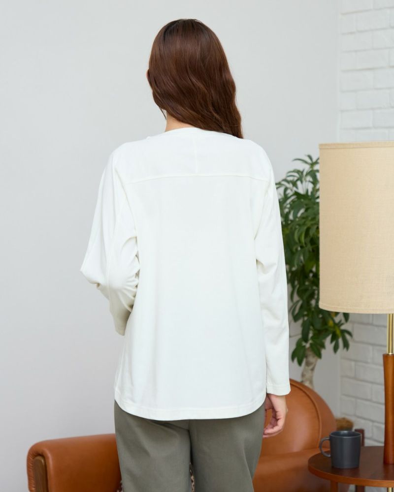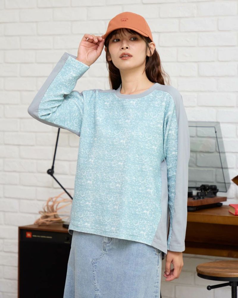 柔らかなパイル素材を使った切り替えデザインの長袖Tシャツ。夏の暑さがやわらぎ始める季節にぴったりの軽やかで快適な着心地です。表情のある素材感で、デイリーコーデにさっと取り入れやすい一枚です。 モデル身長: 168 cm 着用サイズ: M サイズ Golden Bear Ladies' カットソー (Ladies') 【着用アイテム】467R8710 ストレートチノパンツ