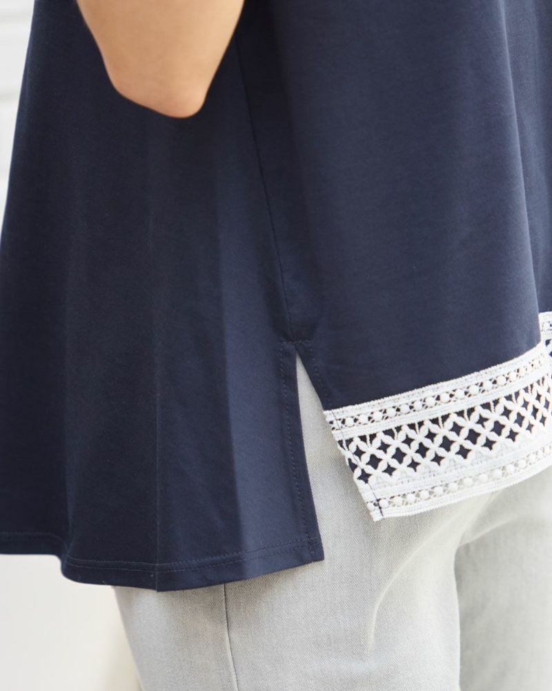 キメが整い、ほどよいツヤもある生地は砕けすぎず大人世代にお薦め。首に馴染み着脱しやすいようにハイネック部分には伸縮性のあるスパンフライスを使用。首周りの肌露出が抑えられ上品に見える点が支持される半袖Tシャツです。リラックス感のあるボクシー型ですが後ろ裾に加えたフレアが揺れ女性らしい柔らかさもある1着。前裾に施した6cm幅のレースがアクセントになり1枚着も楽しめるアイテム。