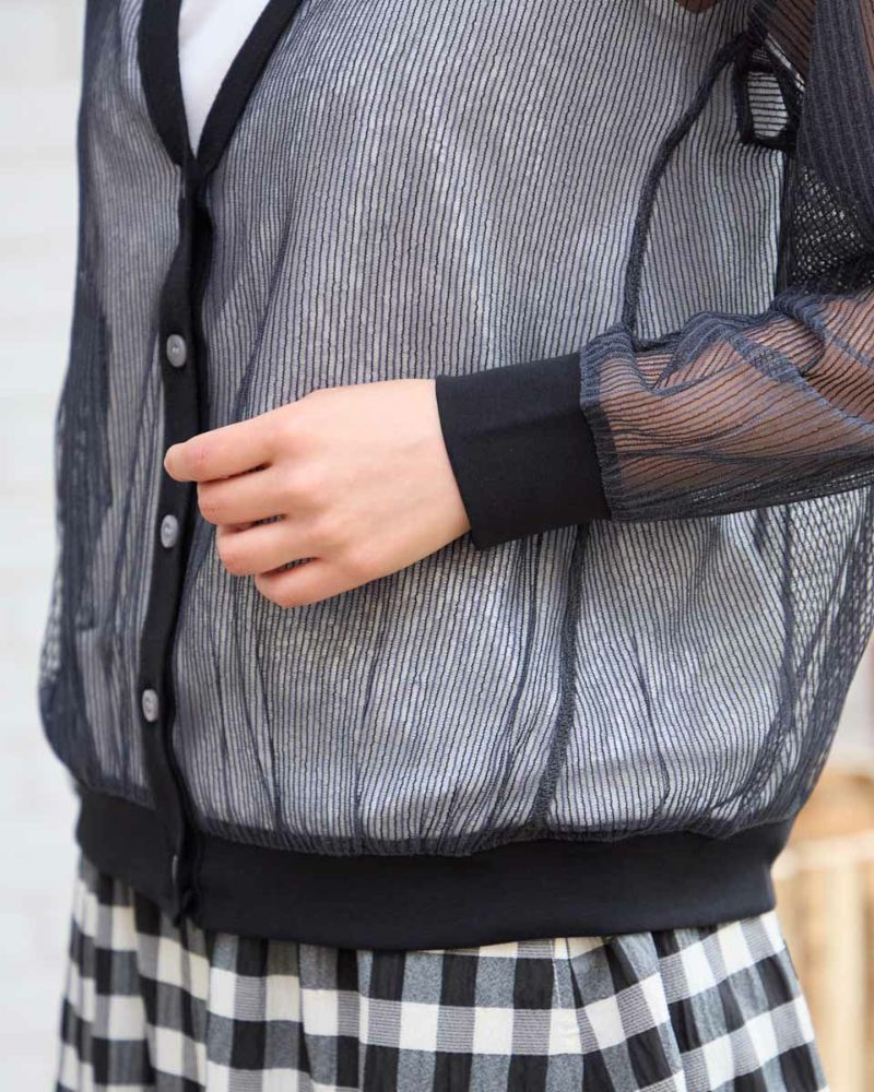3㎜ほどの間隔でストライプ状に並ぶ糸を繋ぐように細い糸が渡りネットのような不思議な編み地を使ったカーディガン。猛暑を活かし大胆な透け感を楽しむアイテム!インナーにTシャツやノースリーブを合わせれば簡単にコーディネートが完成します。シンプルな着こなしのハズしアイテムとしてもおすすめ。長袖でシンプルなオフ白ベースとネイビーベースの展開のためオフィス使いもおすすめです。