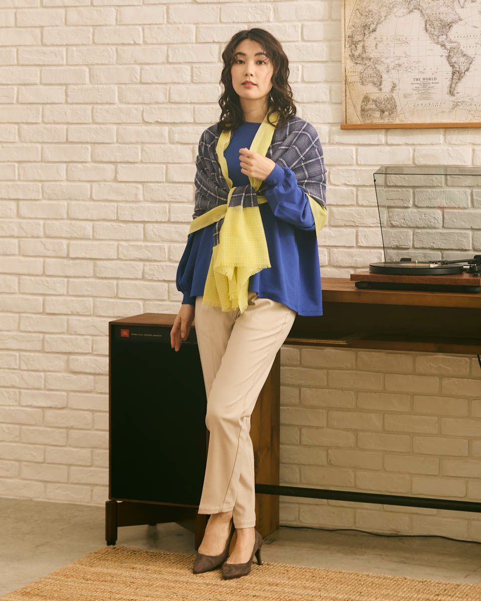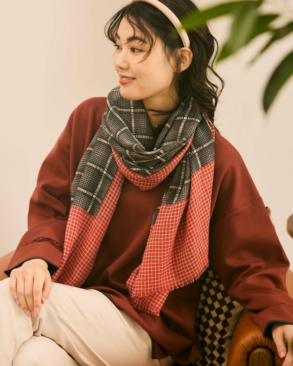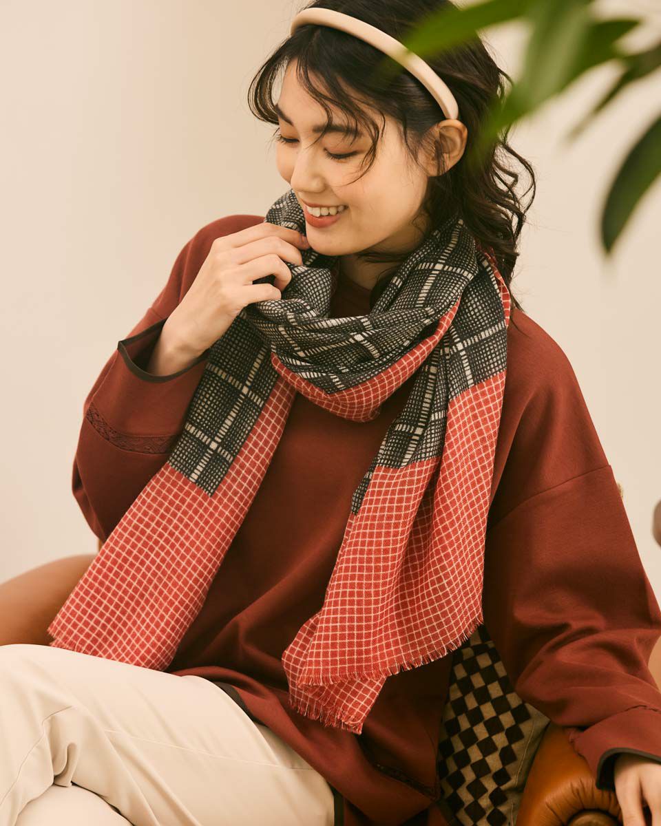 マス目のようなチェックがコーディネートに合わせやすく柔らかで軽いWOOL素材です。着こなしのアクセントに。
