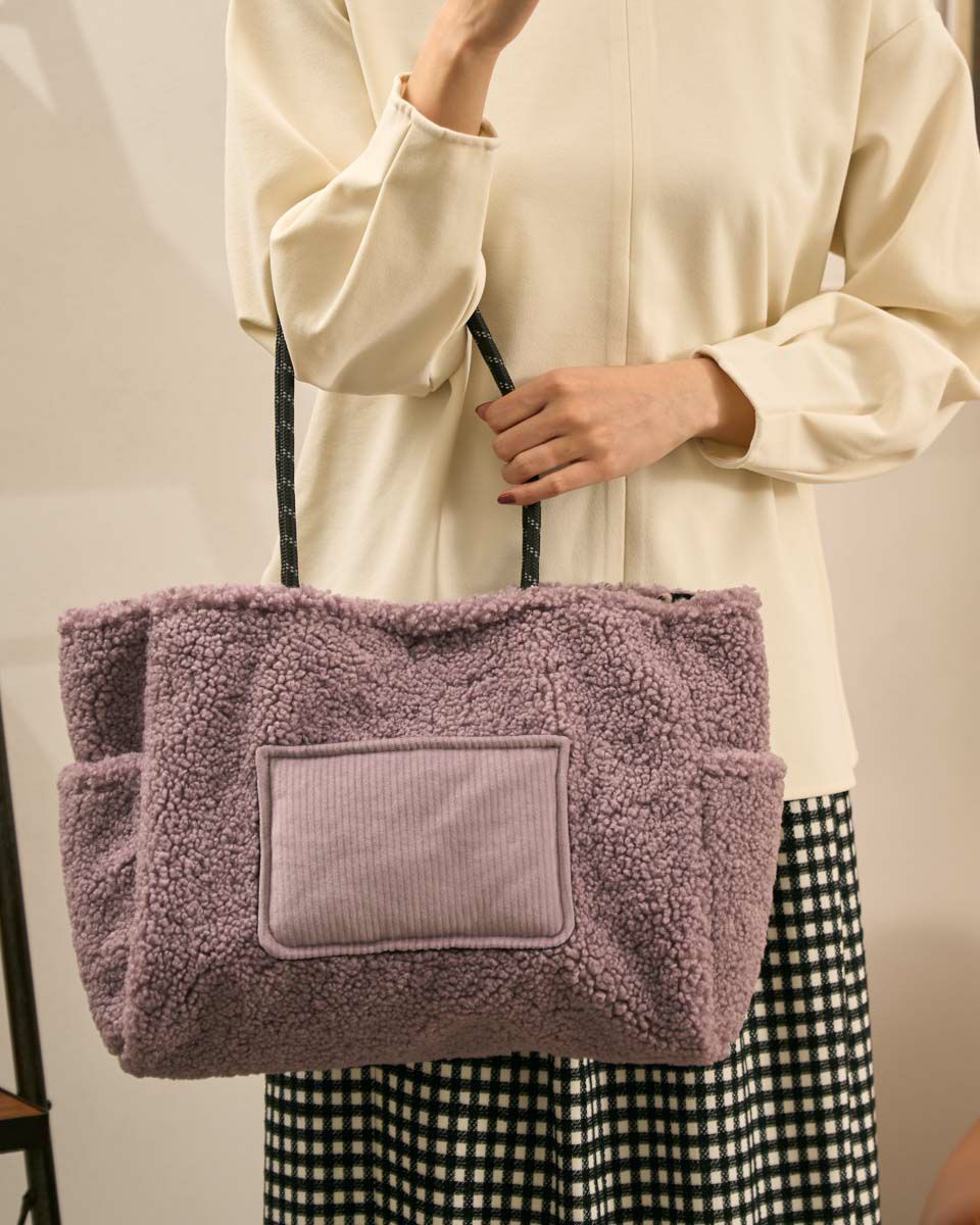 ボアの本体にコーデュロイのポケットを配置した大きめのトートバッグ。寒い季節にぴったりのデザインでコーディネートのポイントになります。 Golden Bear WOMEN アクセサリ (WOMEN) 【着用アイテム】467QC410 ワッフルTシャツ 468QD361 ブラウス 467QD701 1タックテーパードパンツ 468QD751 スカート