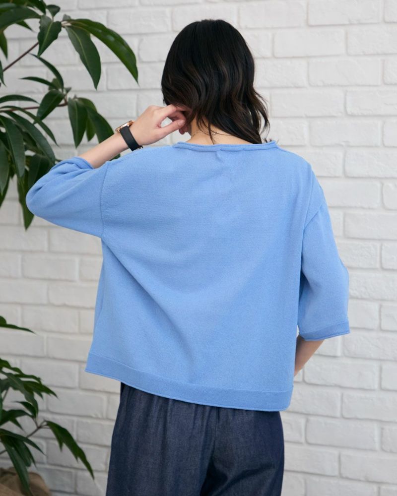 和紙とポリエステルの糸を使用しホールガーメントで編んだプルオーバーです。清涼感ある凹凸感をお楽しみいただけます。触り心地はサラサラしていて張りがあり、強度も高くしっかりした編み上がりのニットです。