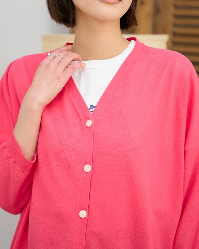 オーガニックコットンを使用したドルマンニットカーディガンです。Tシャツの上からでももたつかず着用して頂けます。夏場の日よけ対策として軽量で持ち運びも便利なアイテムです。 モデル身長: 167 cm 着用サイズ: M サイズ Golden Bear Ladies' ニット (Ladies') 【着用アイテム】467R5701 テーパードパンツ 468R6760 チェックスカート