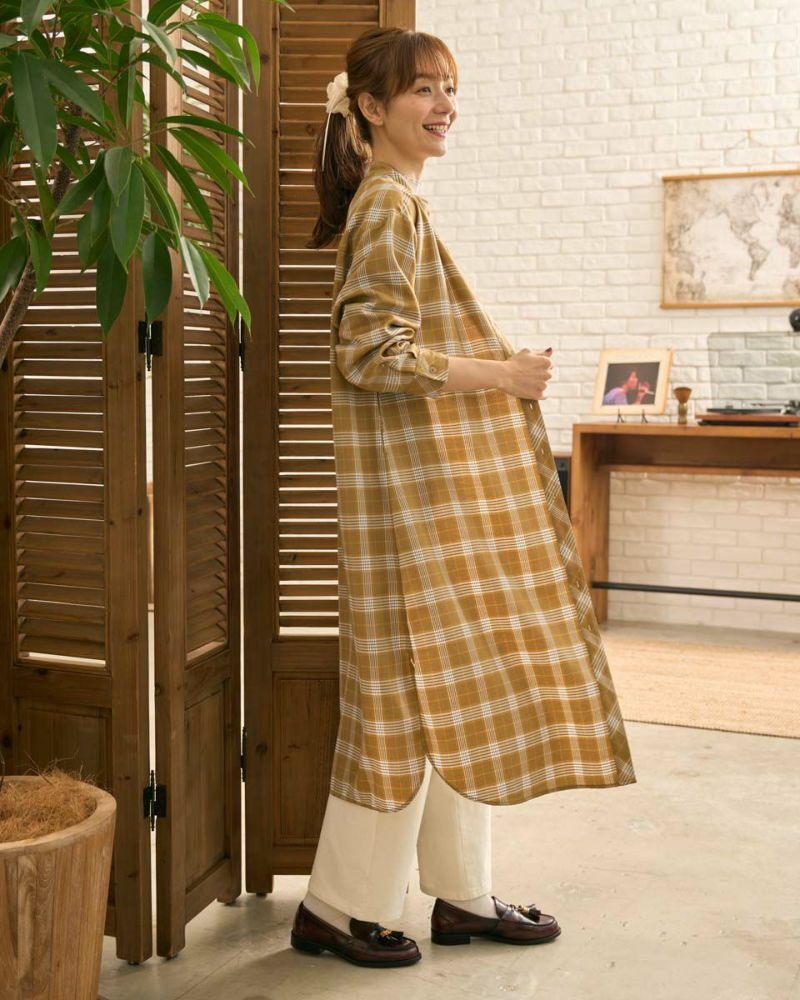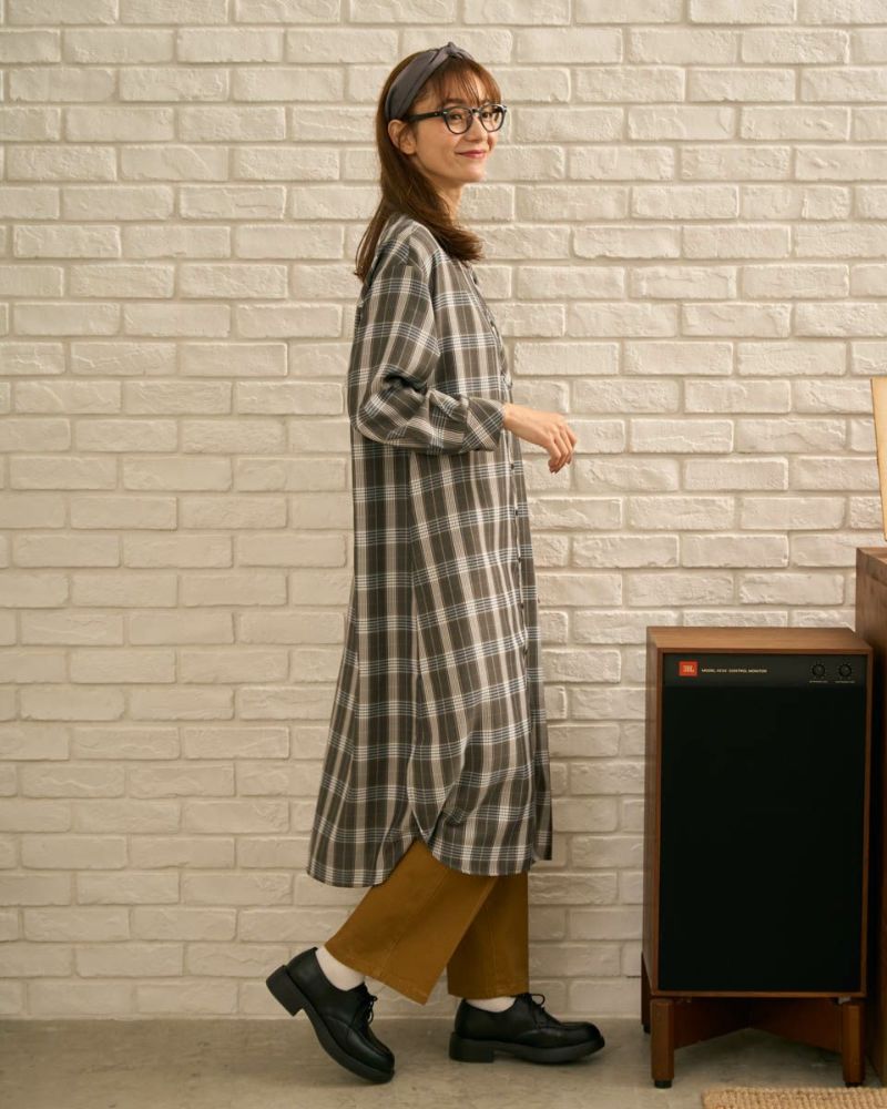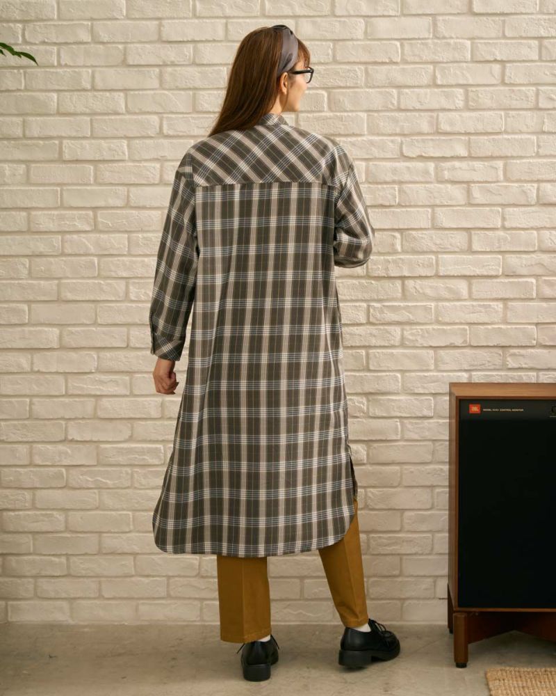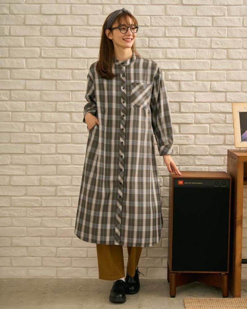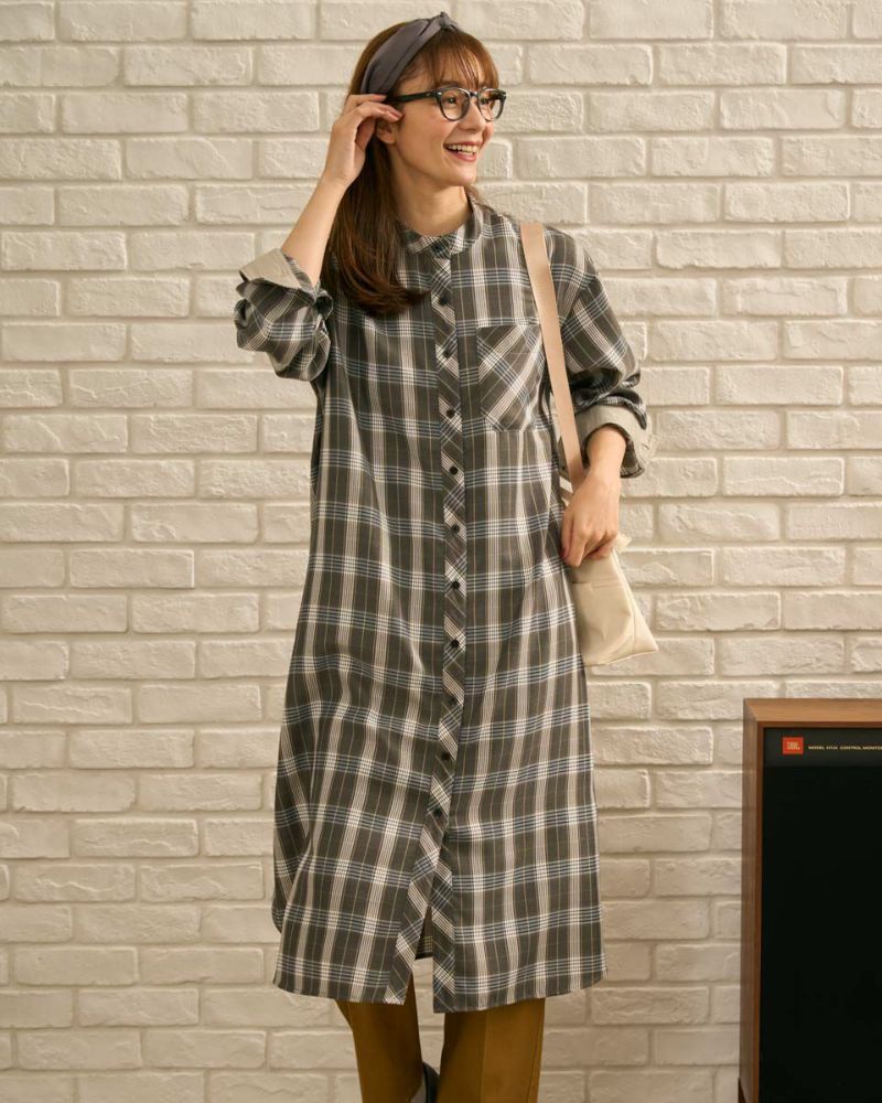 ツイル目の柔らかい先染めチェックの生地を使ったシャツワンピース。生地表面には、ほのかな光沢が有り砕け過ぎず大人世代におすすめです。バンドカラーに設定した襟は顔周りをスッキリと映しタートルカットソーとのレイアードも簡単に決まります。裏面に薄く起毛をかいている点も嬉しいポイント。肌触りがソフトで冷たく感じにくくなっています。フロントの釦を全て開けてガウンのように纏ったりデニムなどのボトムスを合わせてもこなれた雰囲気が出て素敵です。ネックレスやロングブーツで光をプラスした着こなしもおすすめ。