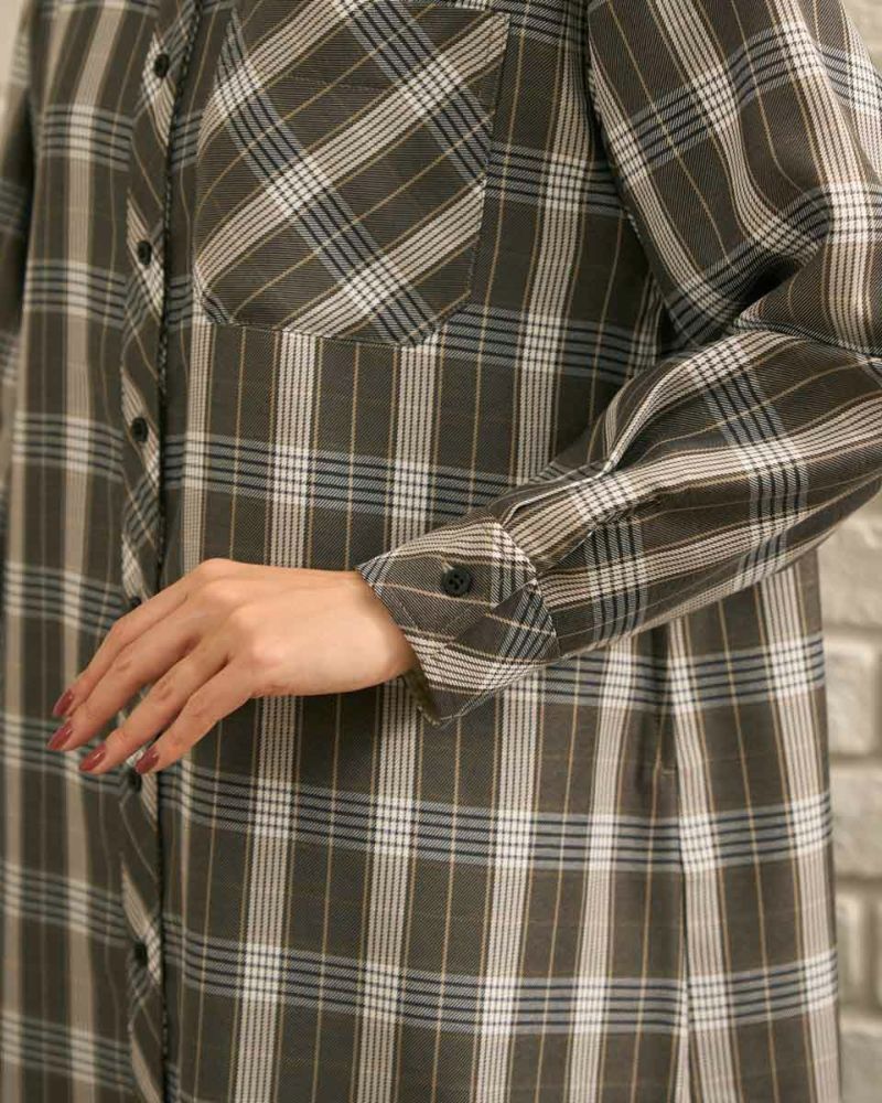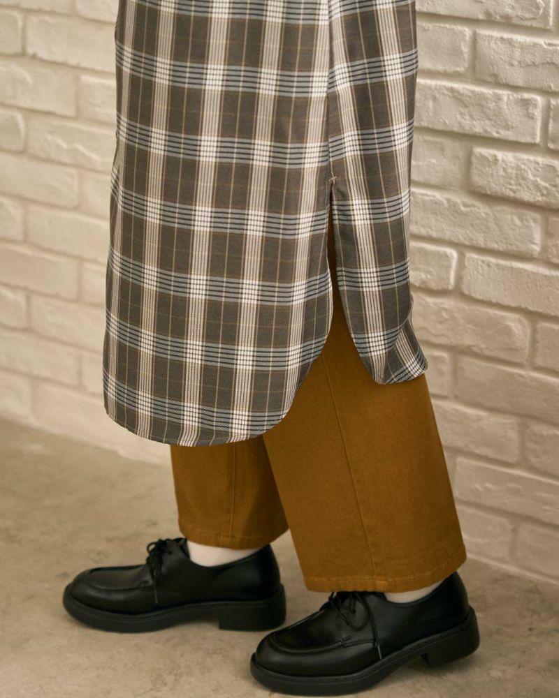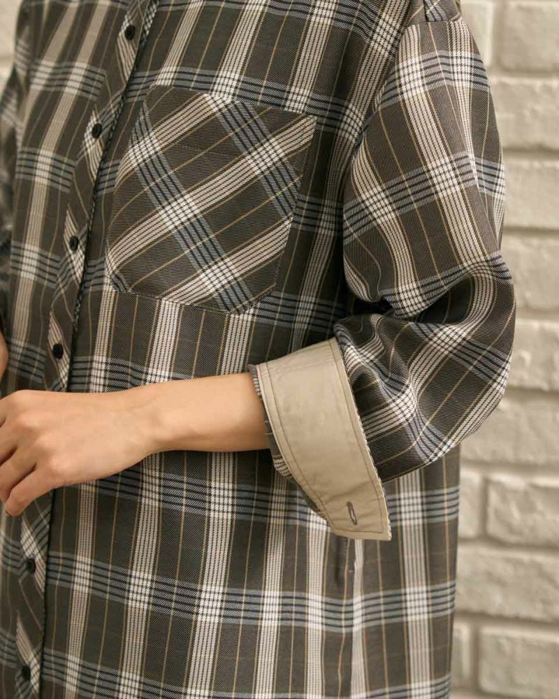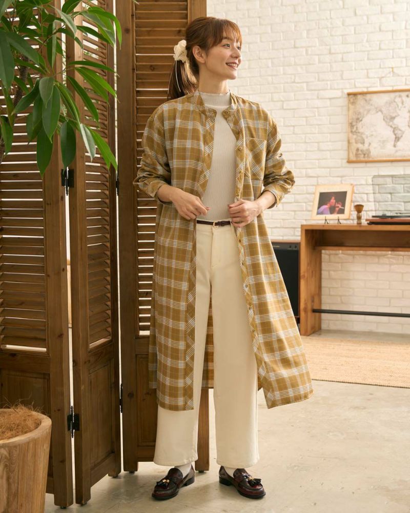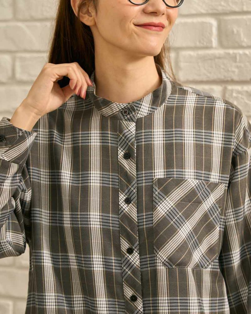 ツイル目の柔らかい先染めチェックの生地を使ったシャツワンピース。生地表面には、ほのかな光沢が有り砕け過ぎず大人世代におすすめです。バンドカラーに設定した襟は顔周りをスッキリと映しタートルカットソーとのレイアードも簡単に決まります。裏面に薄く起毛をかいている点も嬉しいポイント。肌触りがソフトで冷たく感じにくくなっています。フロントの釦を全て開けてガウンのように纏ったりデニムなどのボトムスを合わせてもこなれた雰囲気が出て素敵です。ネックレスやロングブーツで光をプラスした着こなしもおすすめ。