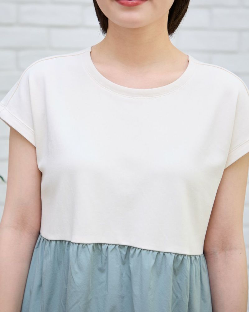 見た目にも爽やかで華やかなワンピース。身頃には表裏ともにキメが整いキレイ見えするスムースを使用。ムッチリと、ほどよい厚みがあり仕立て映えする点も魅力。ウエストから下はマットな質感が上品なポリエステルタフタのティアードスカートを接いでいます。透け感も無く素足での着用も可能。タイトな襟ぐりやフレンチスリーブが清楚でネックレスの他、日傘やカゴバックなど夏小物を添えた着こなしも素敵です。