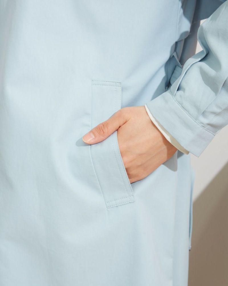 ほのかな艶とコシのある綿ナイロンを使った春コート。裏地も付いているためインナーを着込んでも着脱しやすく、新生活の始まる4月頃までしっかりと活躍してくれる1着。小さめの襟ぐりとタックで膨らむ袖口が可愛らしく、裾に向かって幅を出したAラインのシルエットやベルト先に付けたメタルのコードエンドでよりフェミニンな印象に仕上げています。ノーカラーのためフードやオフタートルなど襟にボリュームのあるアイテムと合わせやすく、トレンドのボウタイブラウスとのスタイリングもおすすめ。背中のヨークと膝丈がきちんと感を演出しオフィスシーンでもお召しいただけます。