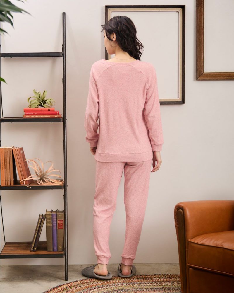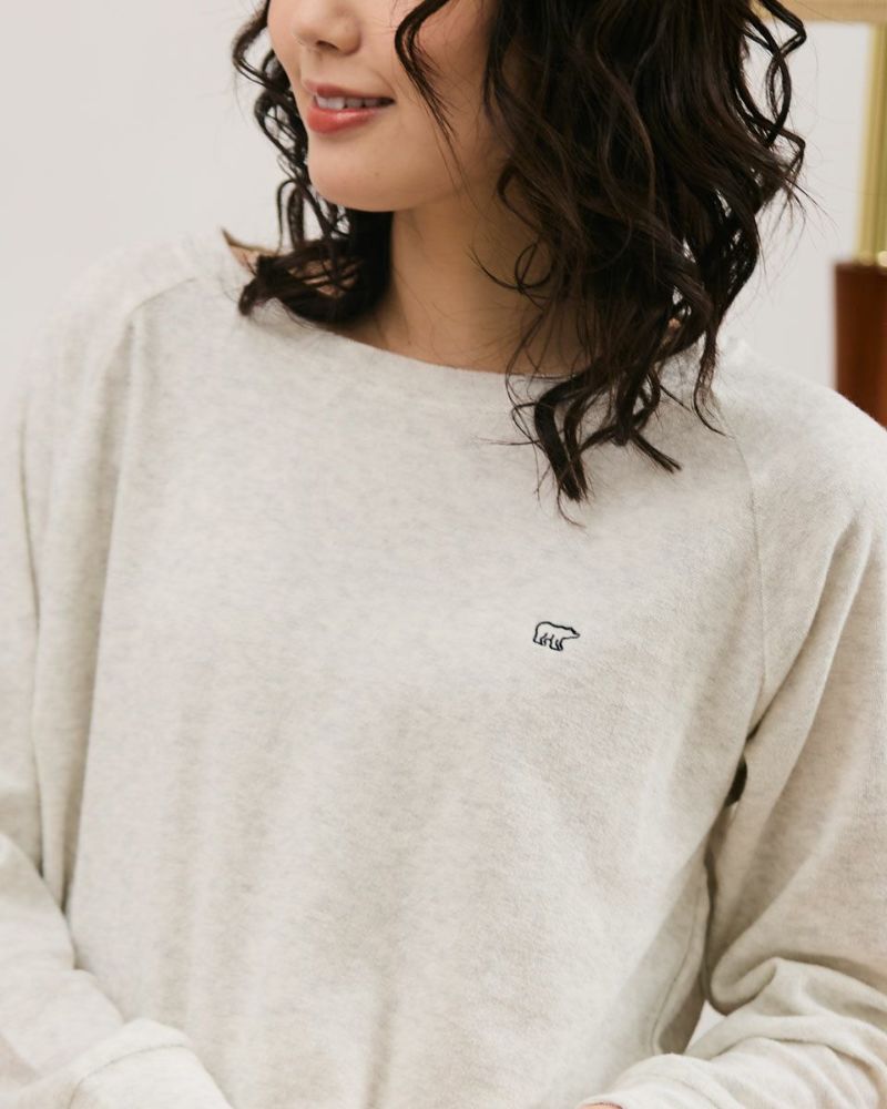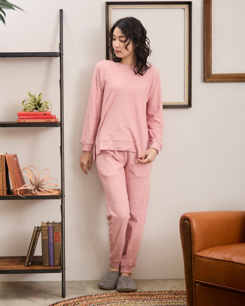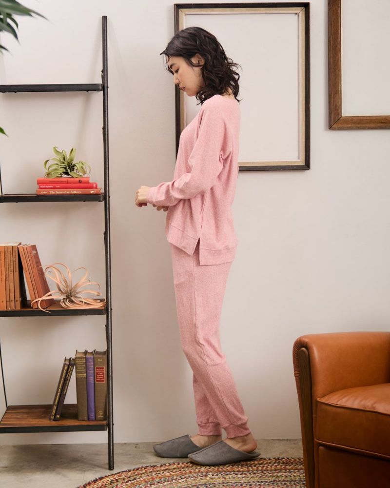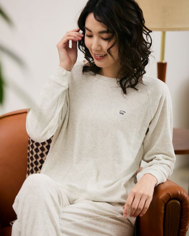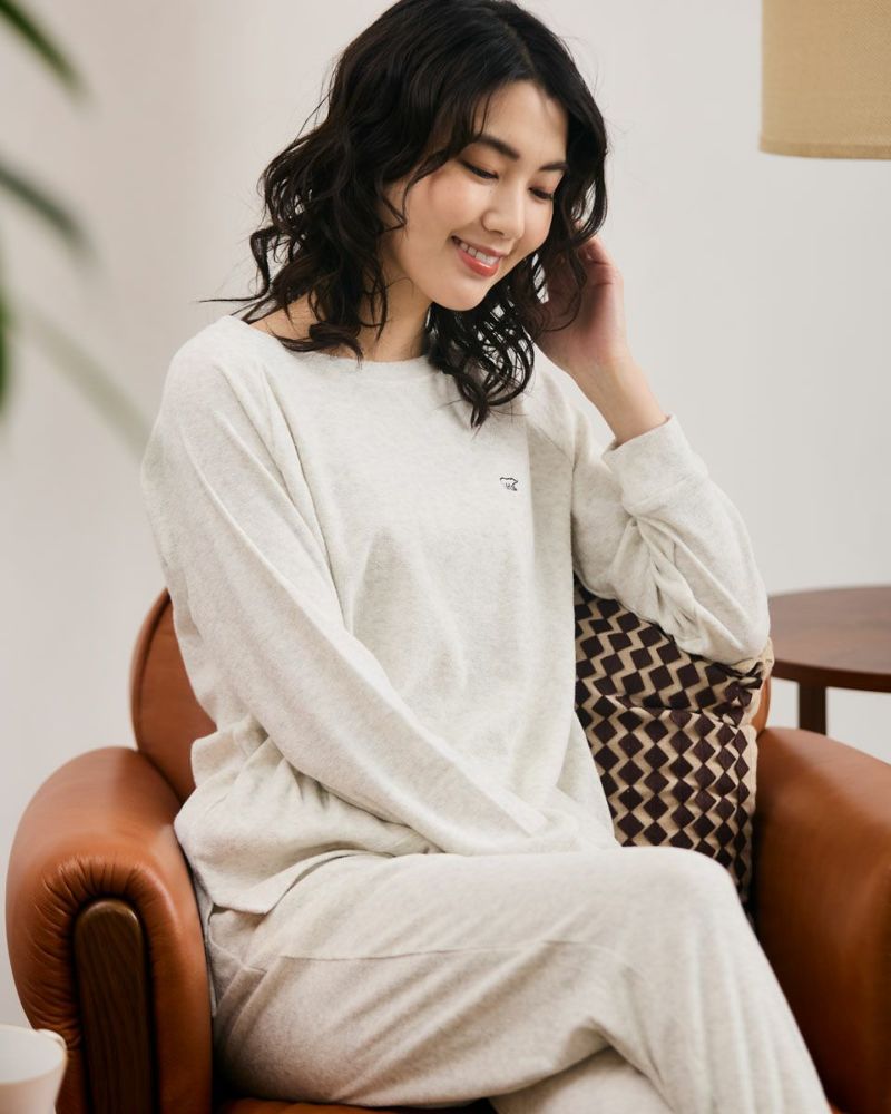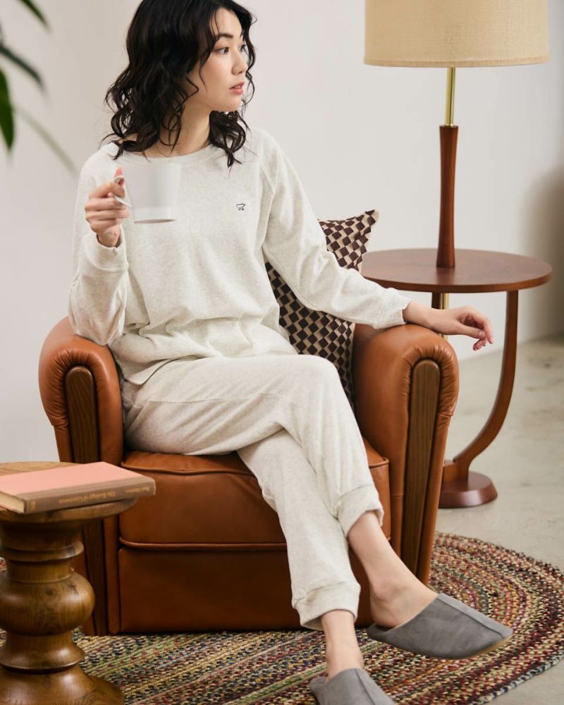 綿100%の長袖・長ズボンのクルーネックパジャマです。肌触りが良く柔らかいニットパイル素材がポイント。ゆったりとしたサイズ感で、着心地の良さがおすすめです。