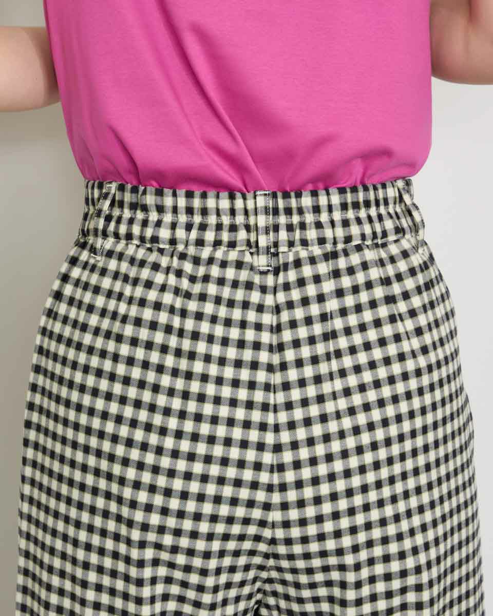 テンセル綿のツィル素材を使用したチェック柄のパンツです。テンセルの柔らかい風合いと清涼感のあるサラッとした肌触りが特徴です。前ウエストはワンタック、後ろウエストはギャザーゴム仕様で全体にゆったりとしたストレートシルエットです。柄違いの2色展開でグレー色のベーシックなグレンチェックにピンクのラインをポイントに入れたグレー系と、ブラックカラーのベーシックなギンガムに黄緑のラインをポイントにいれた白×黒の展開です。