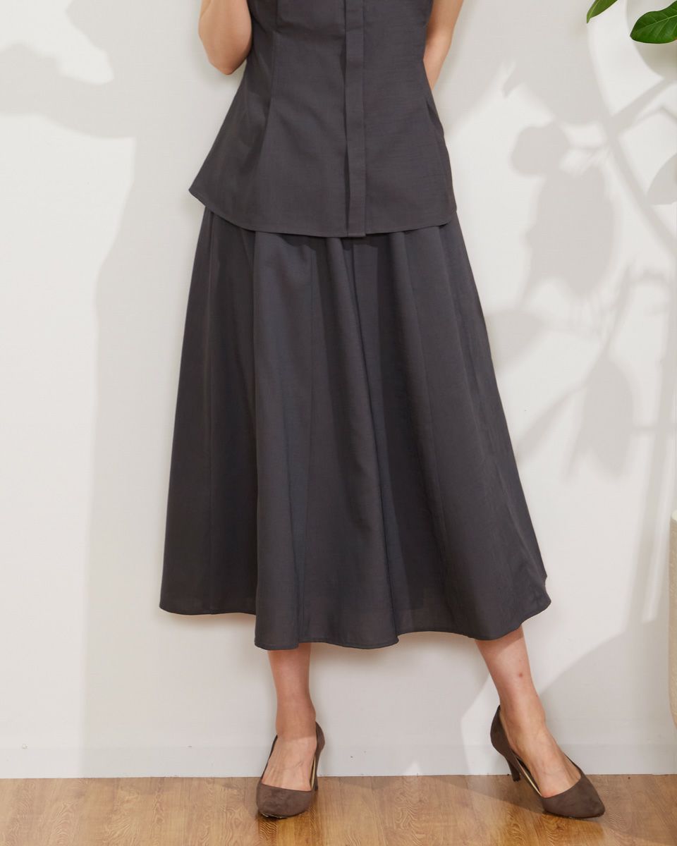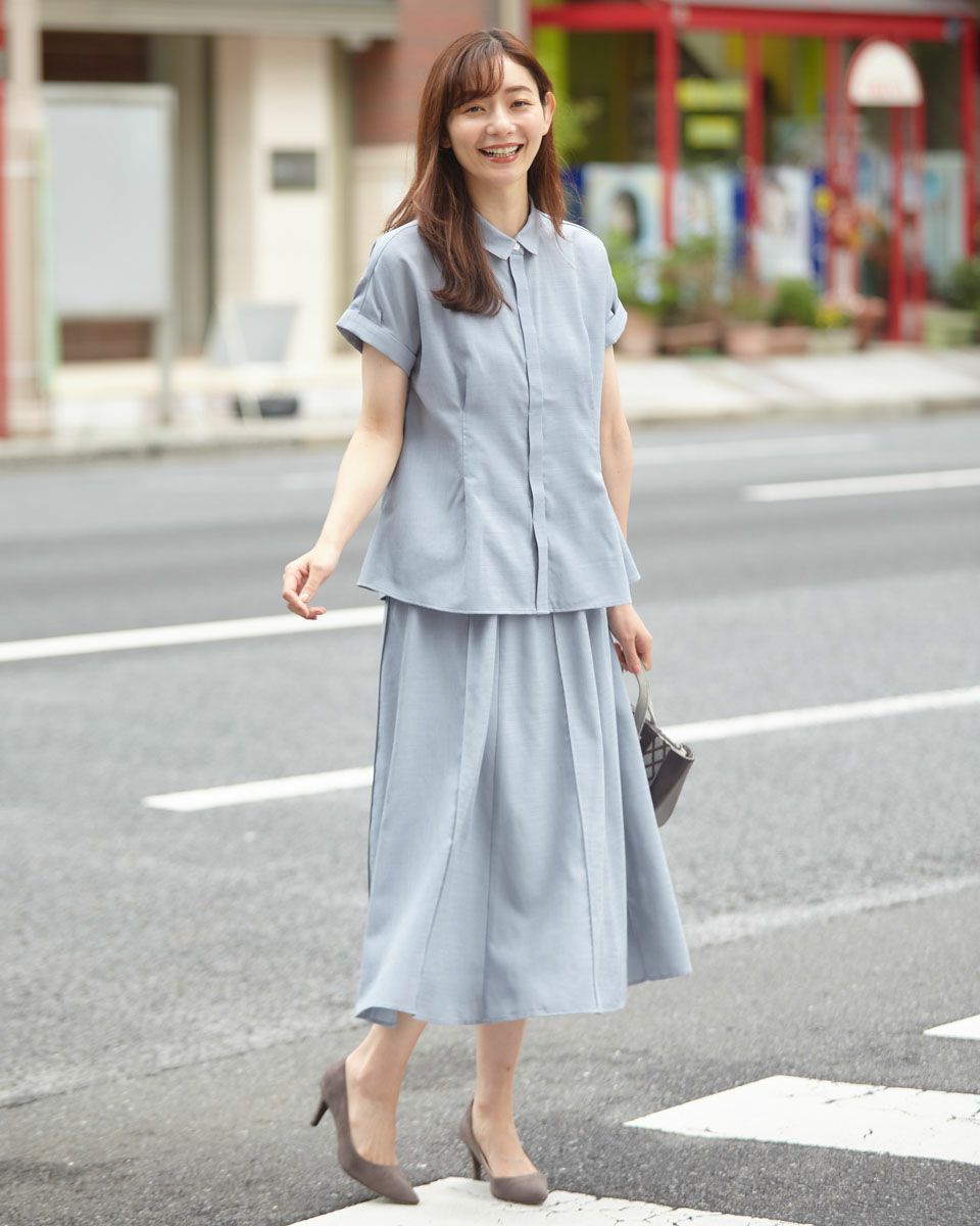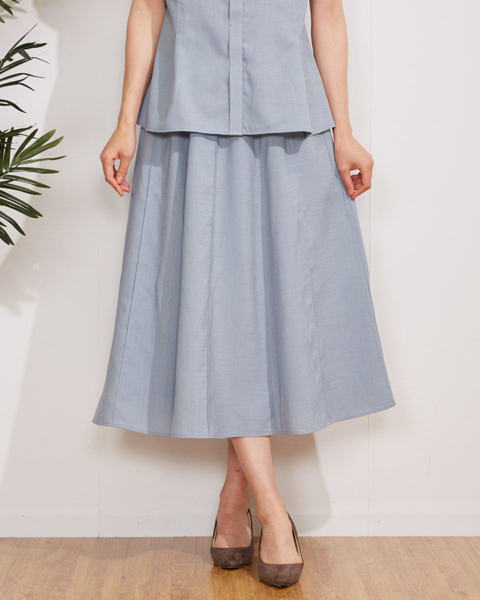 優雅な大人のミモレ丈。フレアが揺れ、はくだけで上品さが纏えるスカート。ほのかなシャリみと糸の節目が涼やかな麻調の素材をセレクト。同素材の468JA350ブラウスとセットアップでの着用も可能です。本体を4枚に接ぎ、接ぎ目に細くピンタックを取って凹凸を付けているため縦ラインが活きプリーツのような雰囲気が特徴です。着脱に便利なプルオンタイプで安心の裏地付き。パールや華奢なアクセサリーが似合うエレガントさもありますが、Tシャツにフラットサンダルやカゴバックを合わせたフェミニンカジュアルな着こなしも可愛くておすすめです。