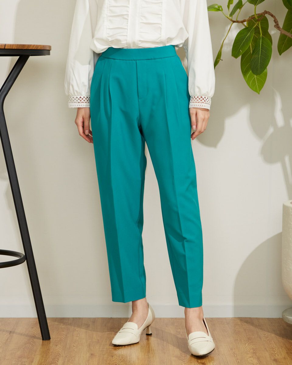 ジップや釦などを使わないゴム仕様のきれいめテーパードです。適度な弾力で足のラインを拾いにくいポリエステル、レーヨンの素材をセレクト。コーディネートが上品に仕上がる定番のシルエットになっています。2本ずつ入れたタックは開かないように中縫いし、腹部の丸みをしっかりと包みます。センタープレスで足のラインが真っ直ぐに見える他、腰高効果もあるためトップスの裾をフロントで少しインする着こなし方もスタイルアップができます。ほのかな光沢できちんと感がありオフィスや学校行事での着用も素敵です。着脱に便利なプルオンタイプのため小さなお子様を持つママにもおすすめです。 モデル身長: 166 cm 着用サイズ: M サイズ Golden Bear White Label (WOMEN) ボトムス (WOMEN) 【着用アイテム】468Q1350 ストライプバンドカラーシャツ 468Q1450 タートルネックカットソー 468Q1650 Vネックカーディガン 468Q1150 ステンカラーコート 468Q2151 ツイードジャケット