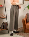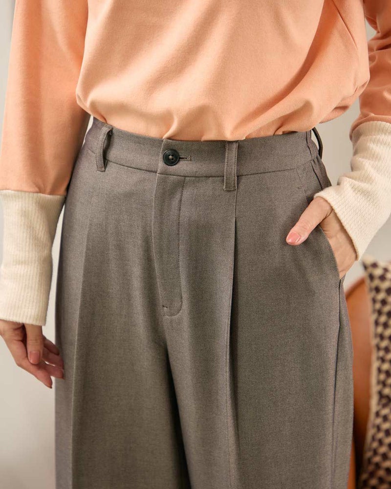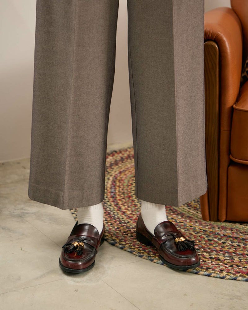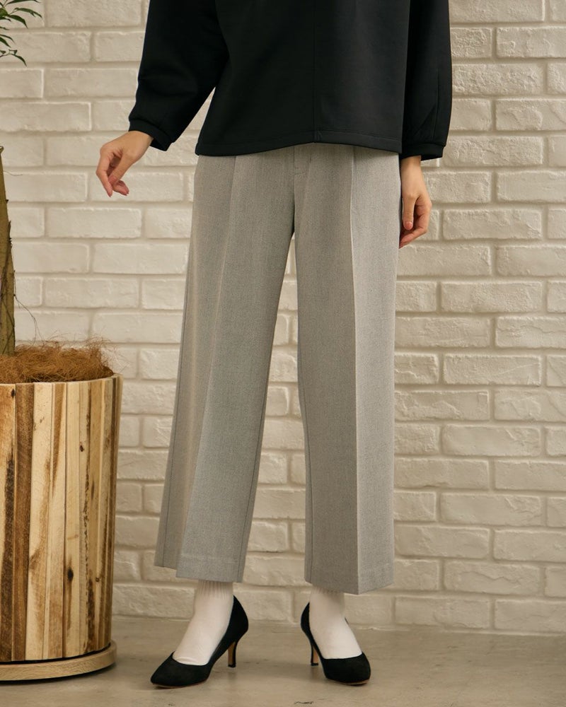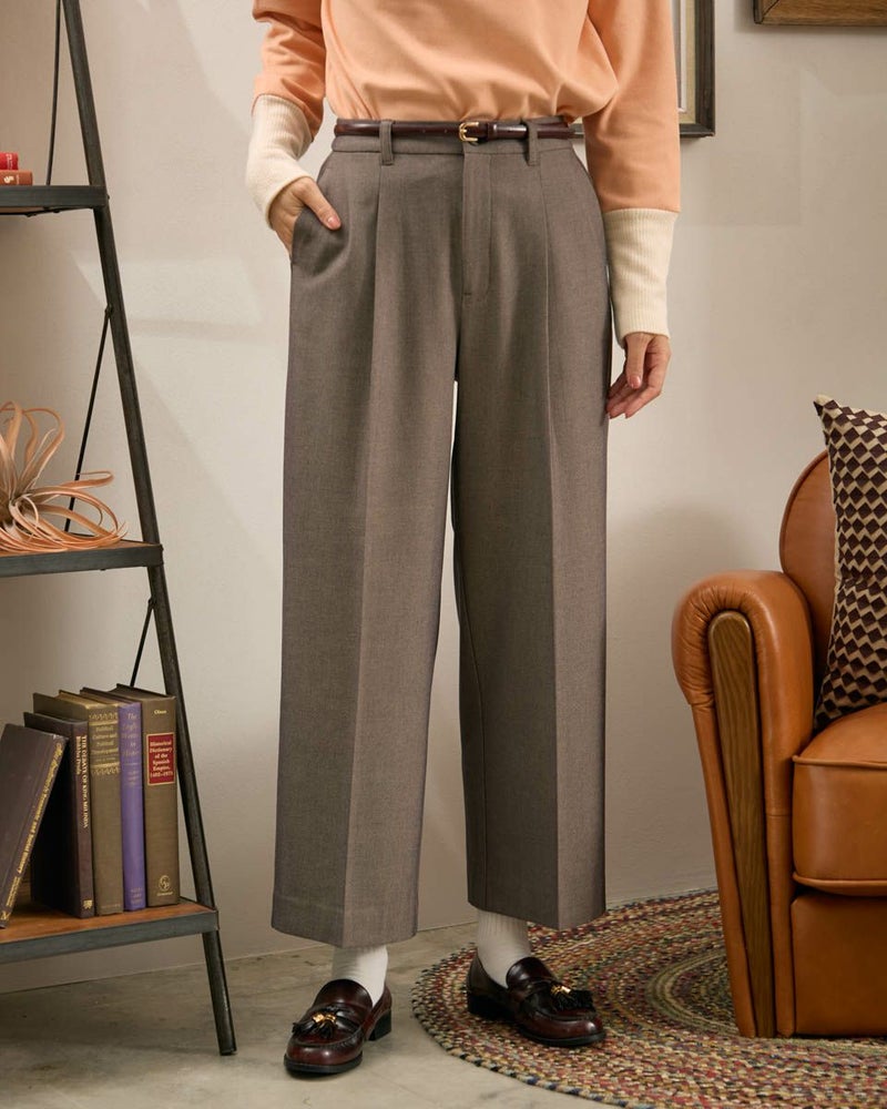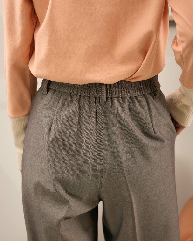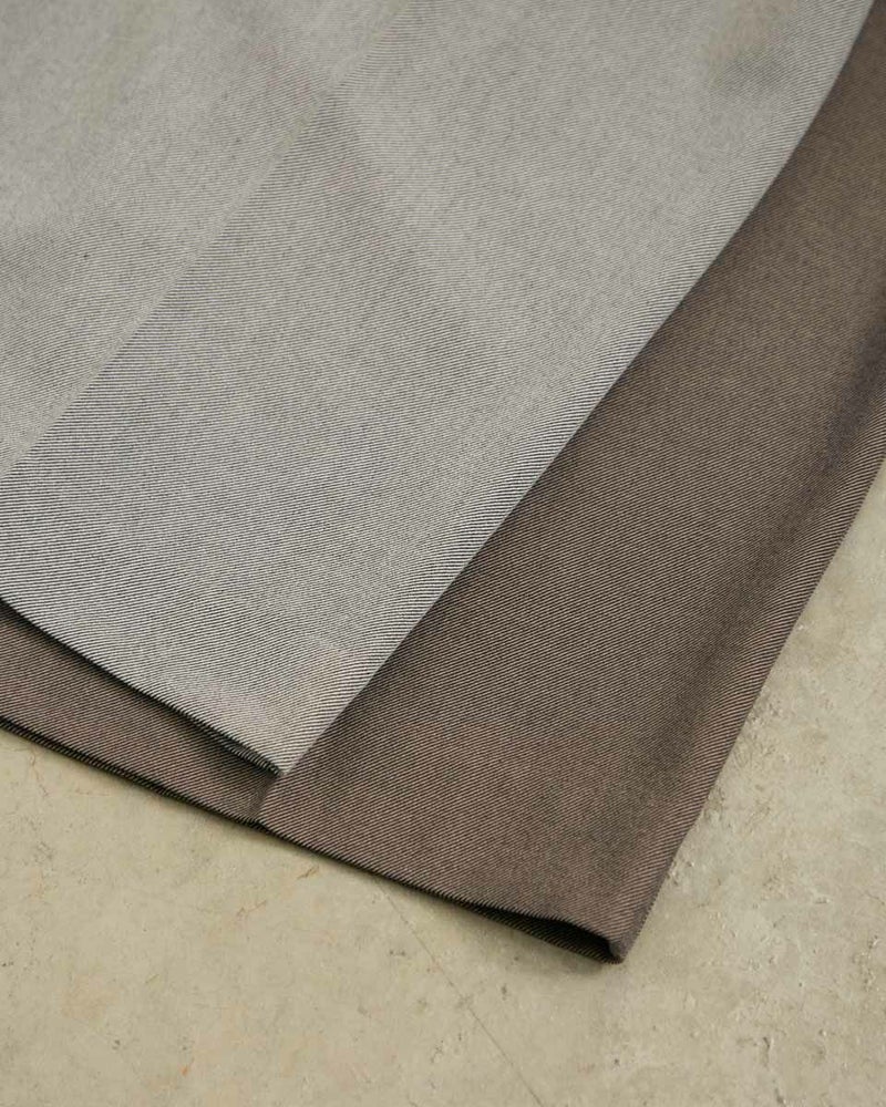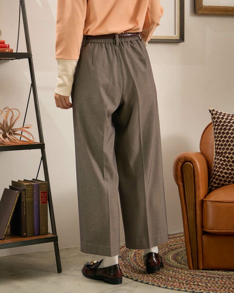 2色の糸が交互に並ぶツイル目は毛羽も少なく清潔でトラッドな雰囲気が特徴です。配色の陰影で感じる色みに奥行きがあって深まる秋にぴったりなパンツになっています。ハンサムなグレー配色と温かみのあるブラウン配色は他のアイテムと馴染みやすく裏面の微起毛で優しい肌当たりも嬉しいポイント。トップスを選ばずデイリーユースが可能。中縫いを施したフロントのタックは腹部の丸みによる広がりをセーブ。ファスナー仕様でインスタイルもきちんと感が増し、ベルトを使ったアレンジもおすすめです。