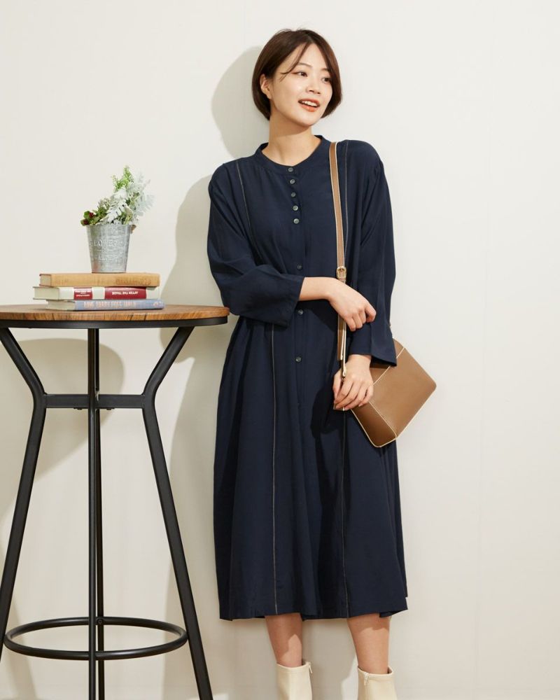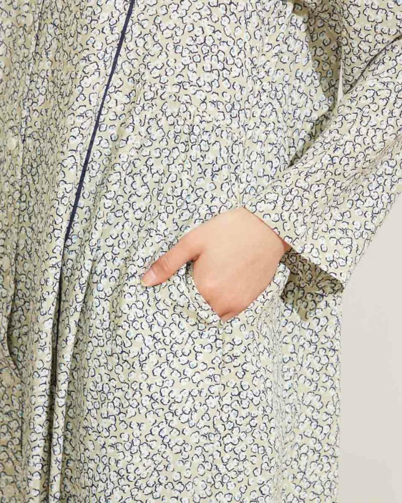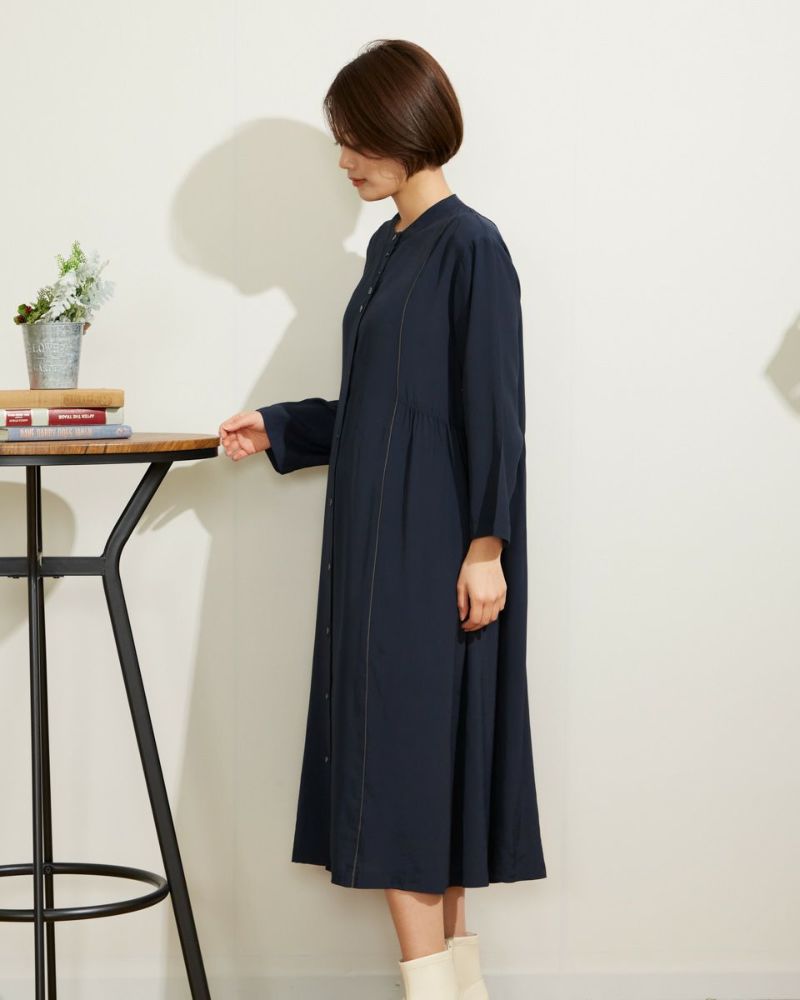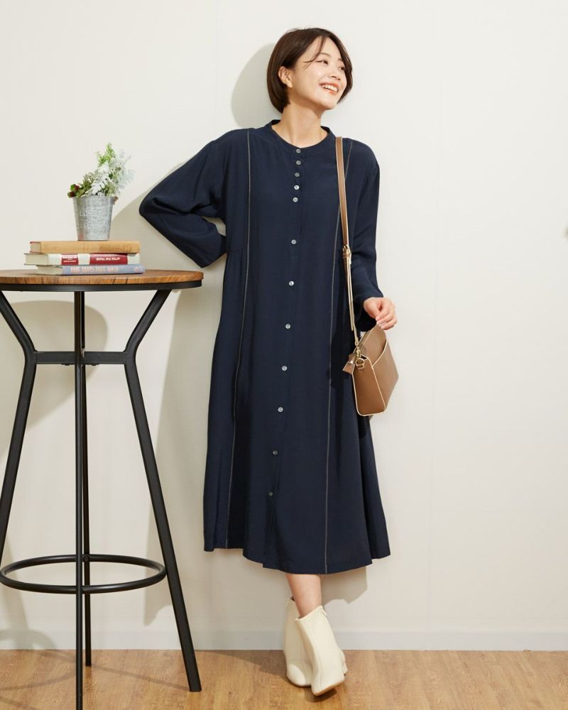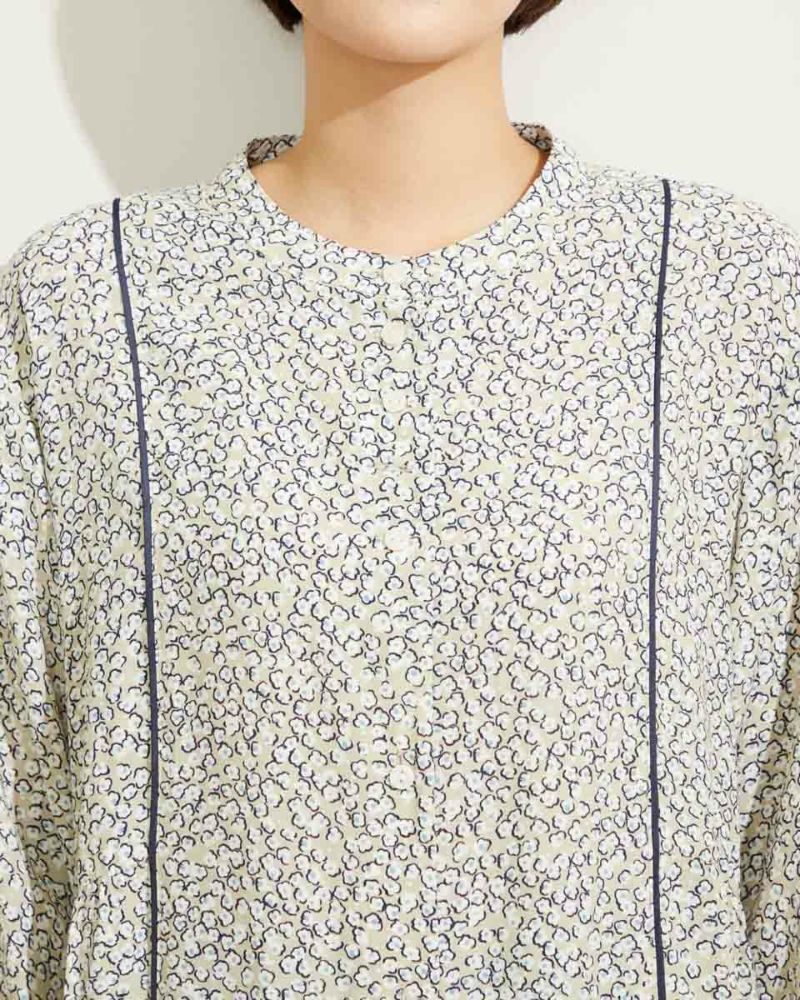 花柄の総プリントとシックなネイビーの2色展開のワンピースです。脇と後ろに入れたギャザーがふんわりと、パイピング使いもメリハリがつき程よいアクセントに。前開きなので羽織としても使用でき、大人が取り入れやすいアイテムに仕上げています。 モデル身長: 167 cm 着用サイズ: M サイズ Golden Bear Ladies' ブラウス (Ladies') 【着用アイテム】468Q1750 ツータックテーパードパンツ 467Q3003 合皮バッグ
