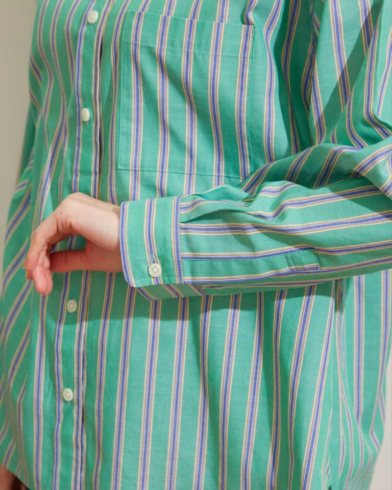 気分を高めてくれるカラーリングのストライプシャツです。定番シャツをベースに、身頃にゆとりを持たせアウトにしてもバランスよく着こなせる着丈感です。1枚で着映えするおすすめアイテムです。 モデル身長: 166 cm 着用サイズ: M サイズ Golden Bear WOMEN ブラウス (WOMEN) 【着用アイテム】467Q3405 タンクトップ 467Q3701 ワイドデニム 467Q3703 テーパードパンツ