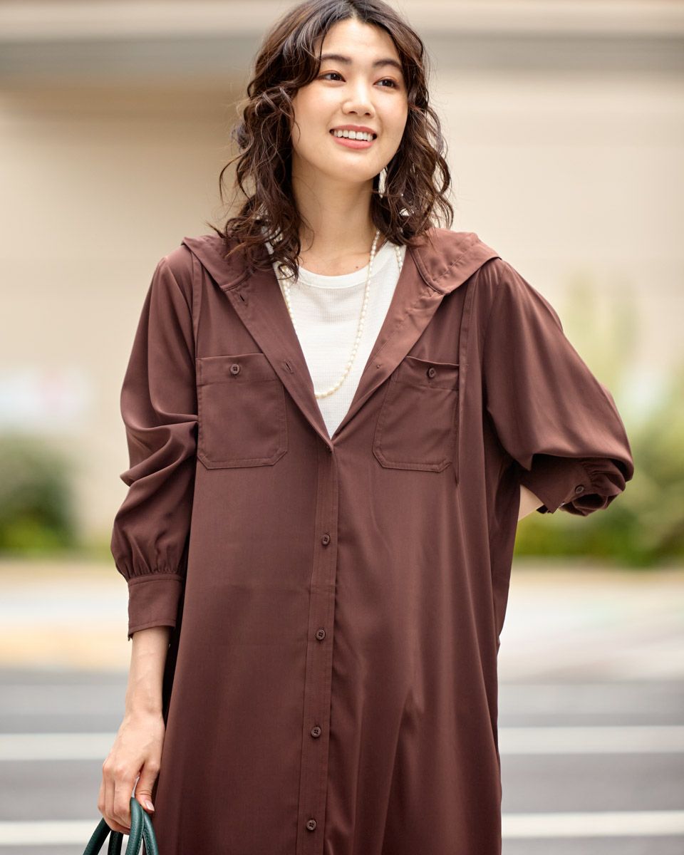 ドレープ性と微光沢のポリエステル素材のフードワンピース。1枚で着ても羽織としてTシャツに重ねるのもおすすめです。両胸ポケットがアクセントで落ち着いたアースカラーです。 モデル身長: 166 cm 着用サイズ: M サイズ Golden Bear WOMEN ブラウス (WOMEN) 【着用アイテム】467Q4412 ボーダータンクトップ 467QA405 リブ使いボーダーTシャツ 467Q6712 フレアパンツ