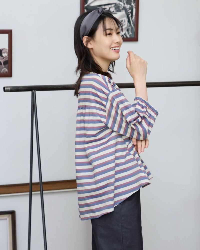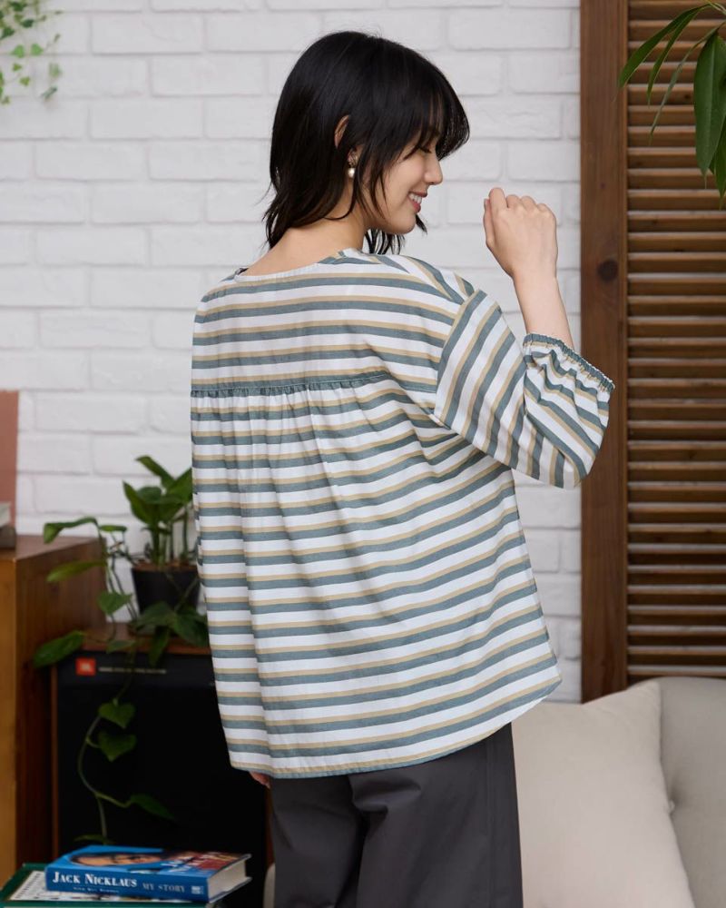 透け感が涼しげな、シースルーボーダーブラウス。軽やかな素材を使った、ゆったりシルエットのプルオーバーブラウス。胸元はボタン開きで、着脱もしやすいデザインです。体のラインを拾わないリラックス感のある着心地で、暑い季節も快適に。 モデル身長: 166 cm 着用サイズ: M サイズ Golden Bear Ladies' ブラウス (Ladies') 【着用アイテム】467R8711 ガウチョパンツ 467R8720 ガウチョパンツ
