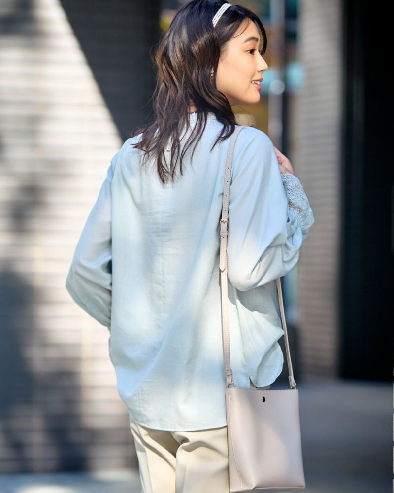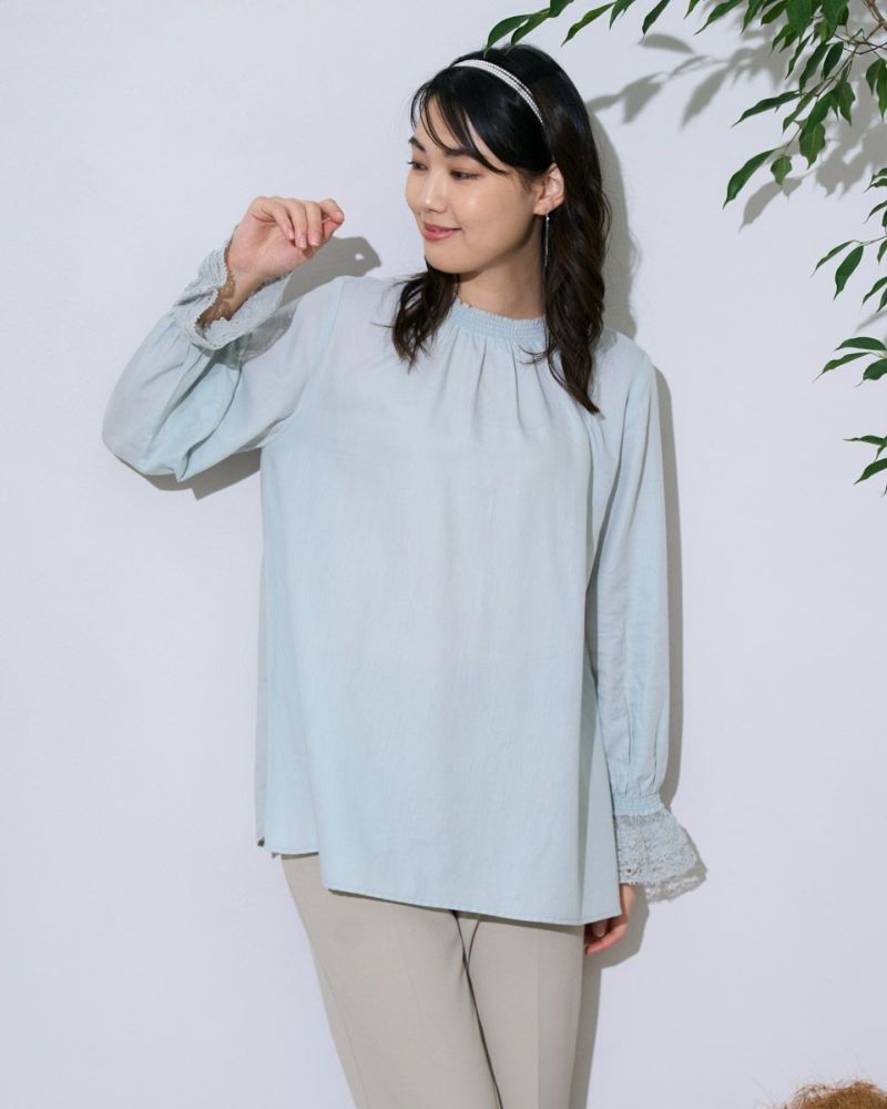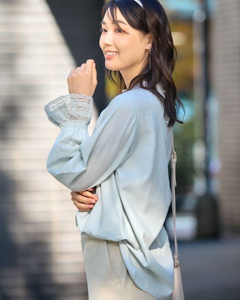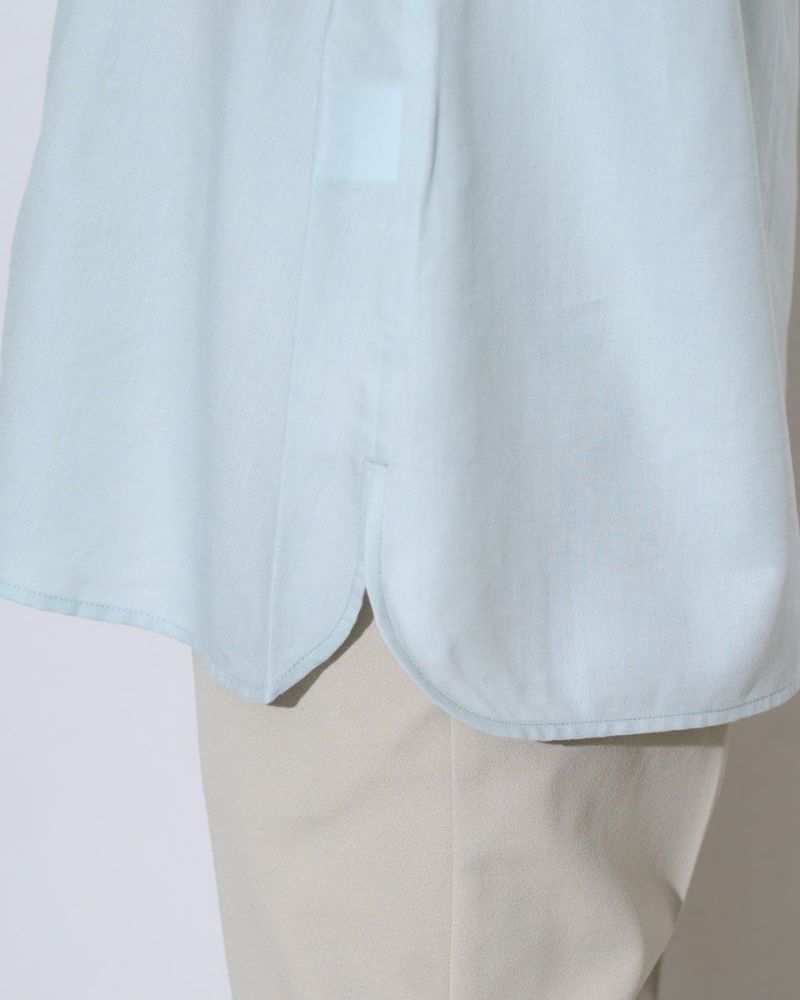 細かくツイルに織られた生地は、ほのかに光沢もありナチュラルすぎないところが魅力。滑らかですが身体のラインを拾いすぎないソフトタッチな被りのブラウス。少し立ち上げた襟と袖口に施したシャーリングで生地に立体感が足され華やかさも一緒に纏えるアイテム。ジャケットやカーディガンとの相性も良く、オフィス使いにおすすめ。優しい春カラーでパールを添えて謝恩会など親しい方とのパーティでお召しになっても素敵です。