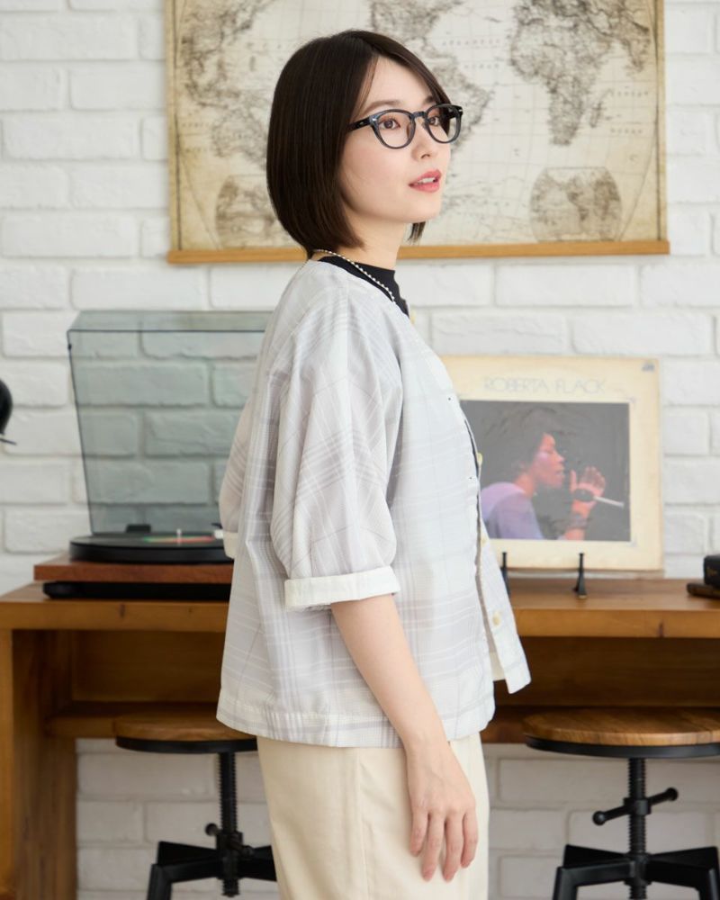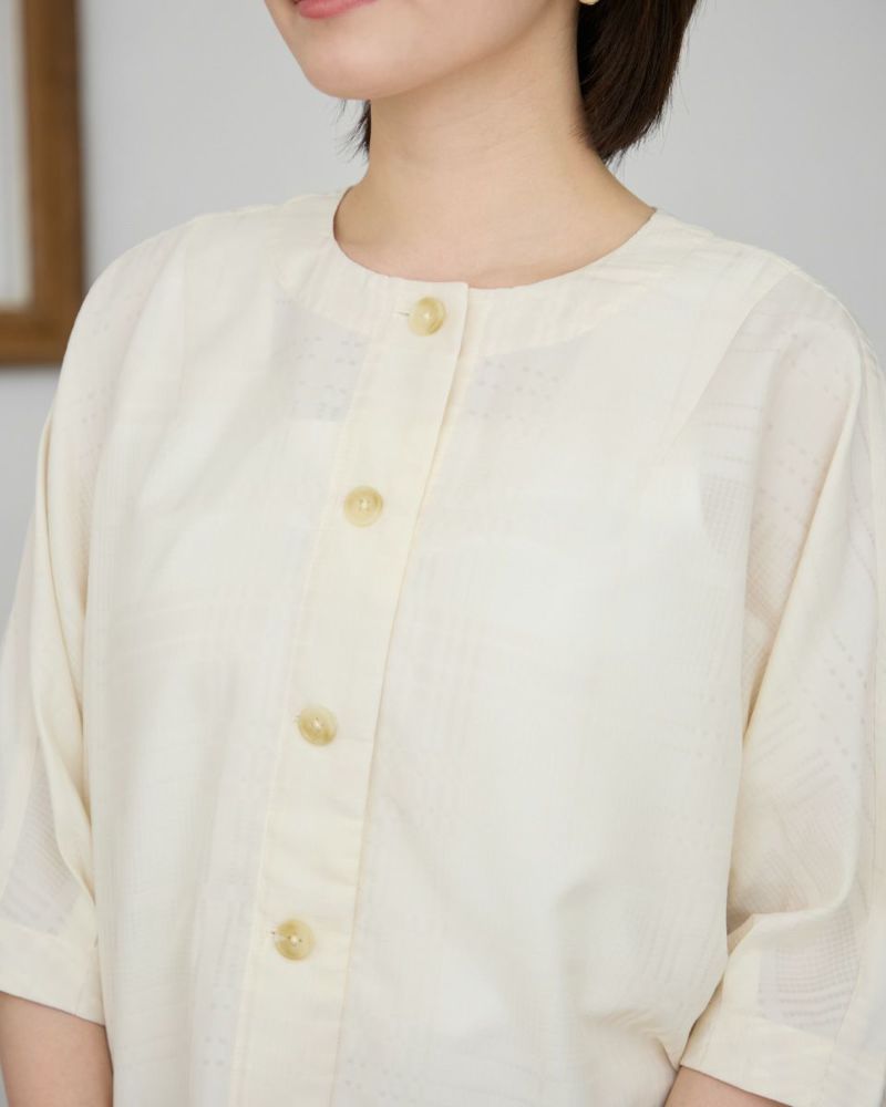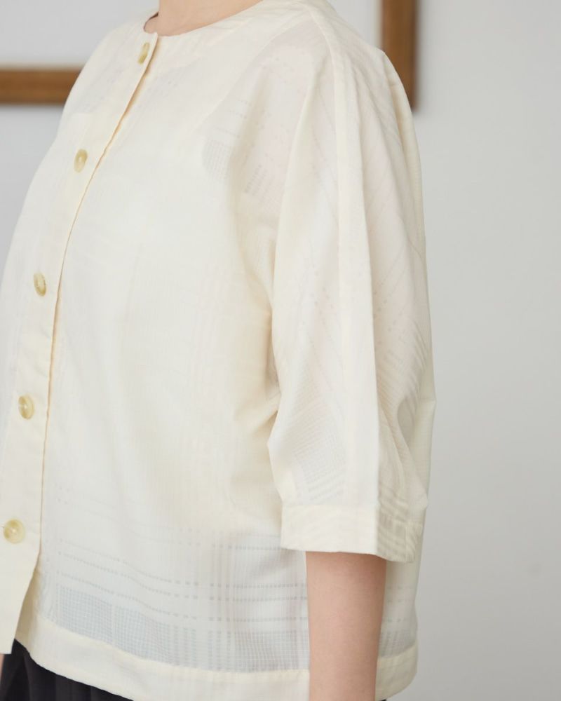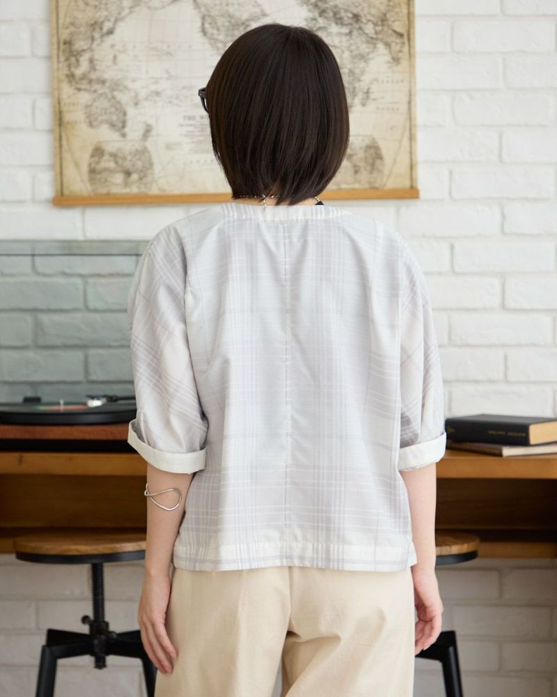 親しみのある折り紙のやっこさんのような形のアイテム。ドルマンスリーブでアームホールに切り替えがなく袖下で生地のたわむ様子にこなれた雰囲気がある所も素敵なポイント。薄く、ほのかに透け感のあるベースに馴染むように織られたチェック柄がモダンで大人世代におすすめ。生地に表情があるのでサッと羽織るスタイルもサマになります。大ぶりのネックレスでパンチを効かせた着こなしも受け止めてくれる1着です。