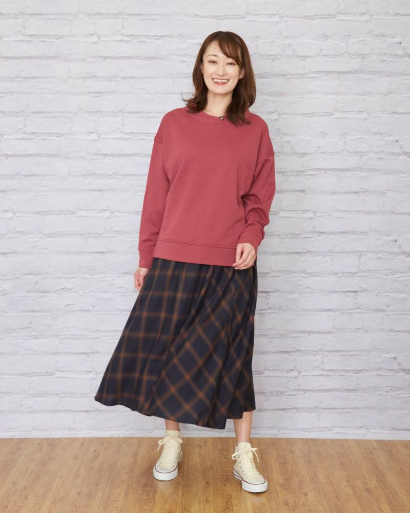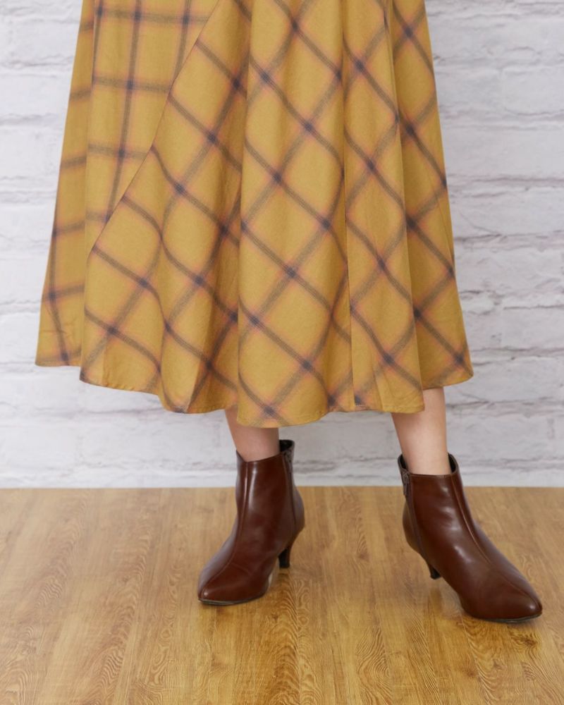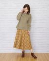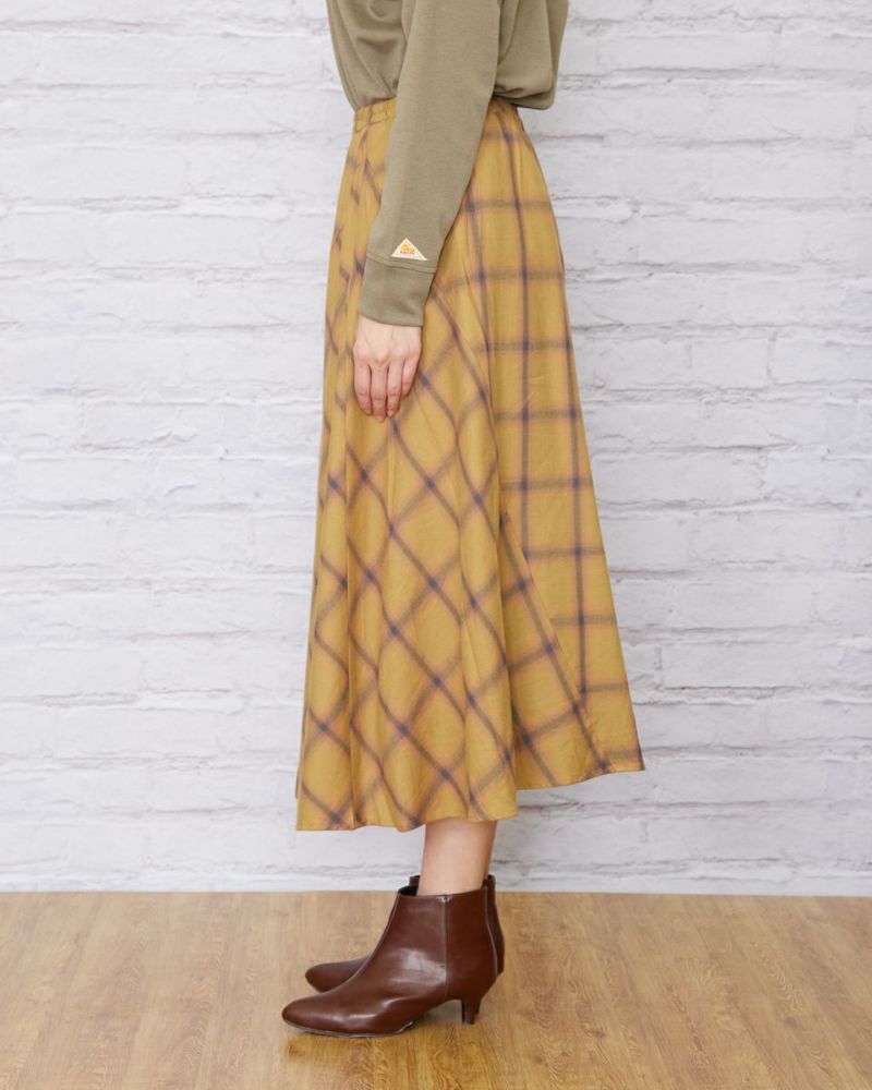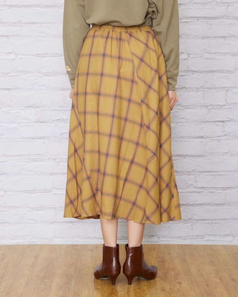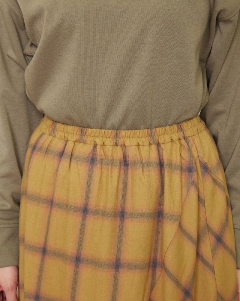 深みのあるマスタードとネイビーをベースに微光沢のある糸で織ったオンブレチェックのスカートです。徐々に色の濃淡が変わり他の色が染み込んだような変化が魅力。両サイドを接ぎ、チェックを斜めに使うことで動きが増すので歩く姿も素敵です。ウエストは楽チンなゴム仕様。裏地付きが嬉しいポイントです。パーカやTスウェットが好相性。足元はスニーカーやショートブーツを合わせてみてください。