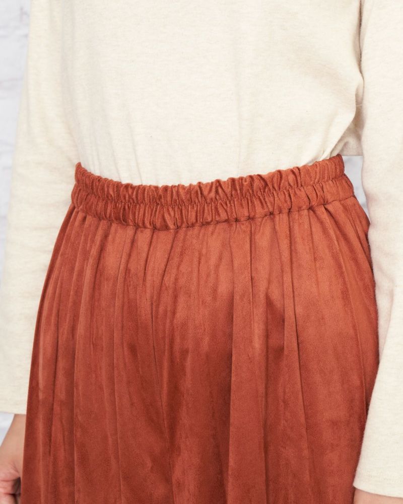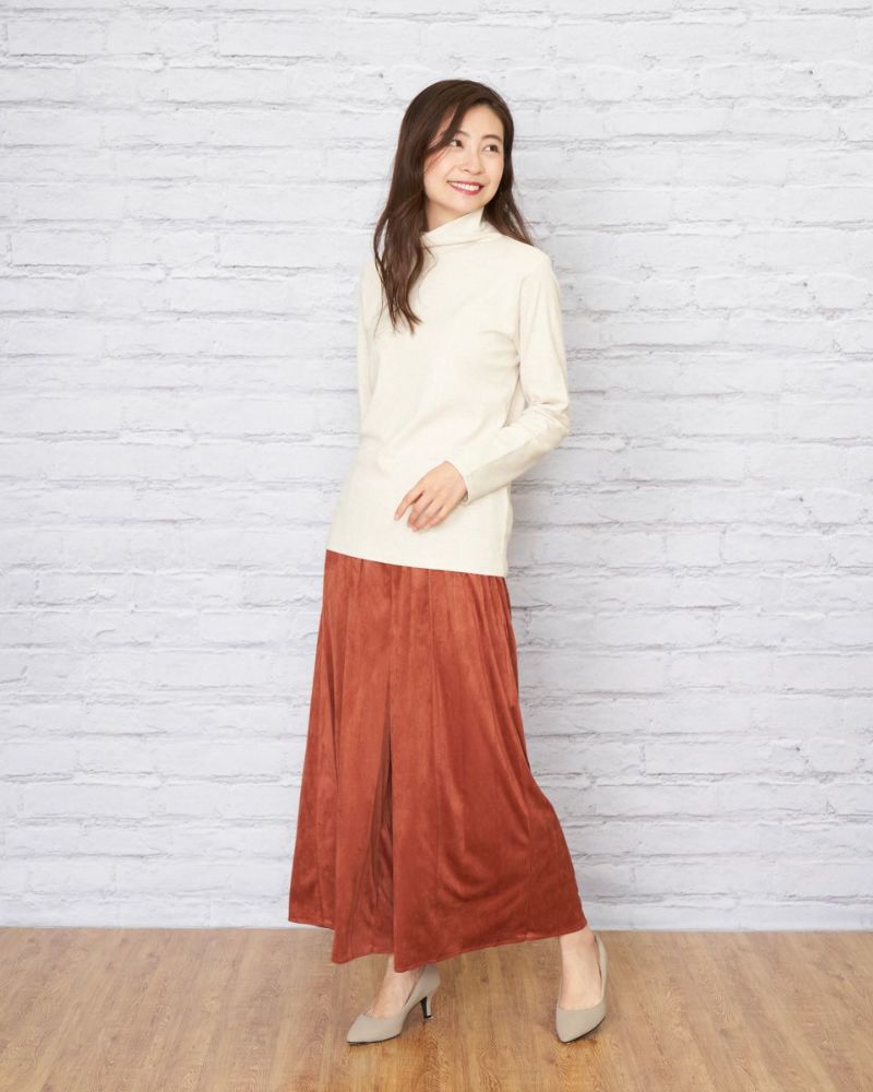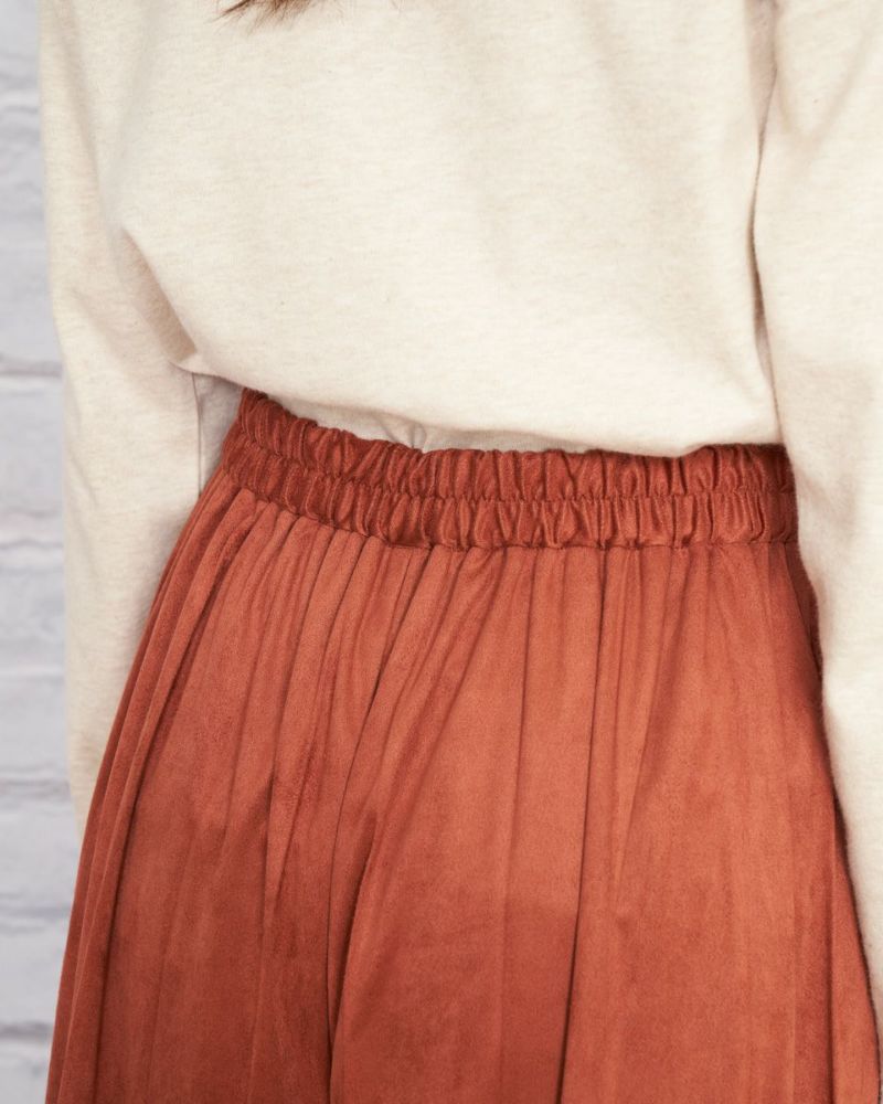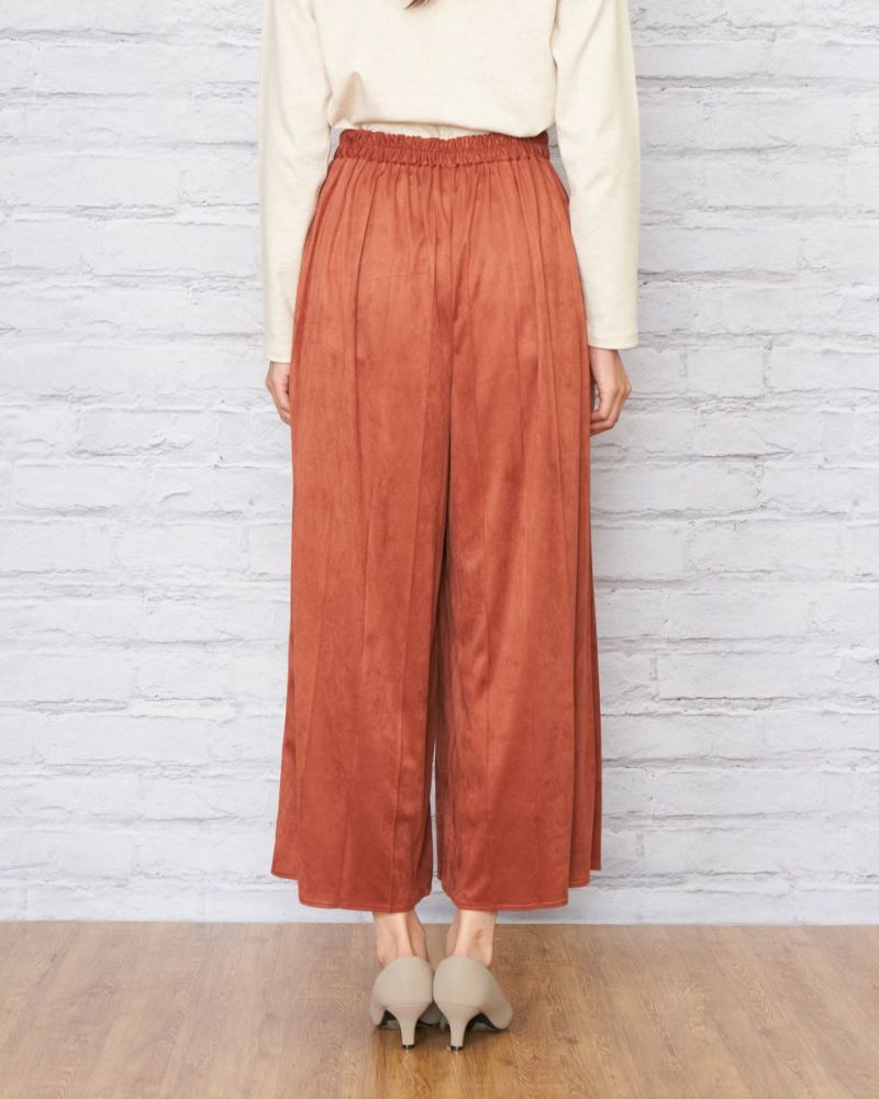 細かい毛羽の触感が気持ちよく、かすかな光沢で上品な印象のフェイクスエードを使用。深い色が映えて秋にぴったりのスカーチョです。プリーツを太めに設定し薄くかけたことで、主張し過ぎず着用しやすいデザインに。スカート見えするパンツ仕立ても便利で安心なポイント。裏地付きなのでタイツを合わせてもモタつきません。