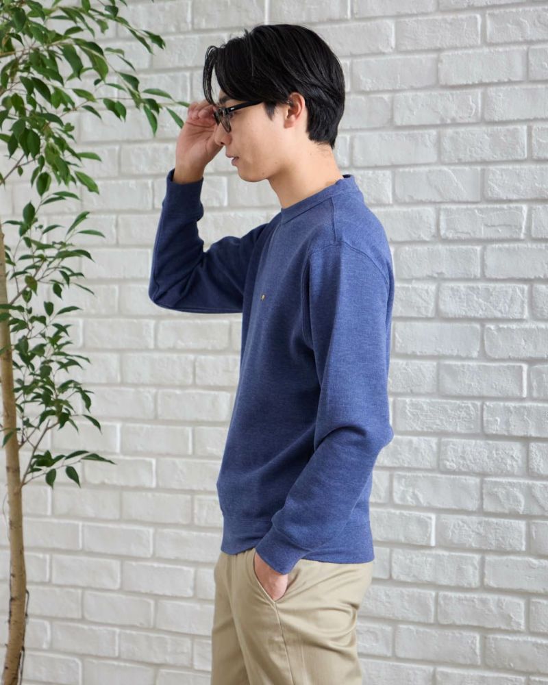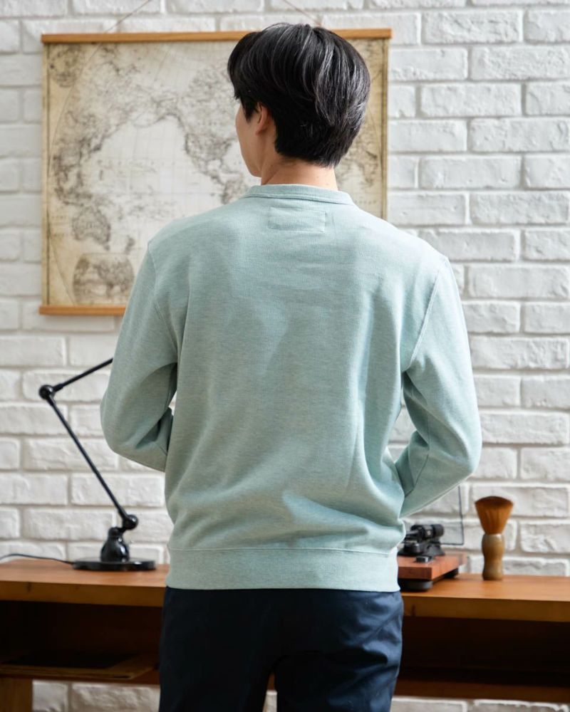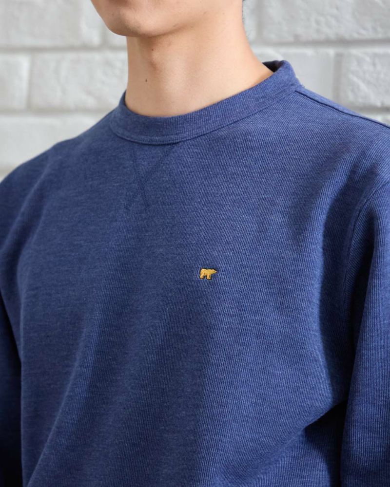 金熊刺繍のクルーネックスウェットです。柔らかく着心地のよいダブルフェイス生地を使用しています。襟部分をバインダー仕様にすることで、ヨレにくい強度の襟に改良しました。春を感じるさわやかな色合いをお楽しみ下さい。