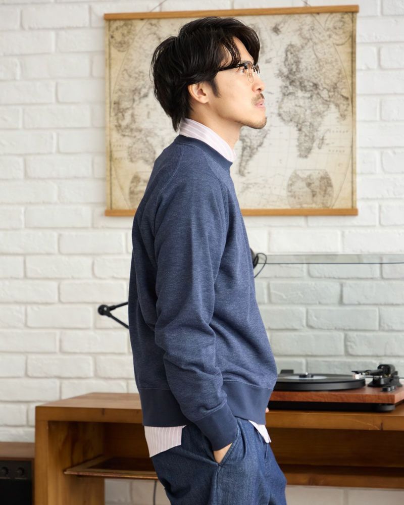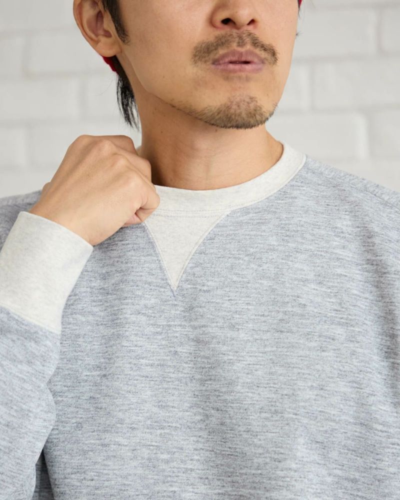 軽い着心地のクルーネックスウェットです。吸水速乾性に優れた裏毛生地を使用しています。肩から脇にかけての切替えをフリーダムスリーブ仕様にすることで腕の動きやすさを実現しました。脇に適度なゆとりをもたせつつ、見た目はすっきり。アウターを着ても袖や脇部分の収まりが良く、脱ぎ着が楽なのもおすすめポイントです。ヴィンテージ感のあるアメカジアイテムです。