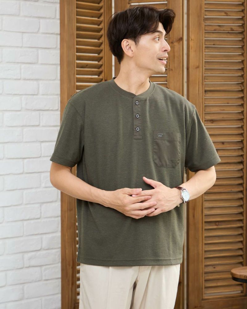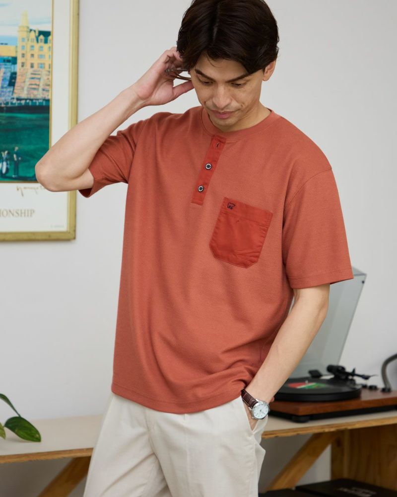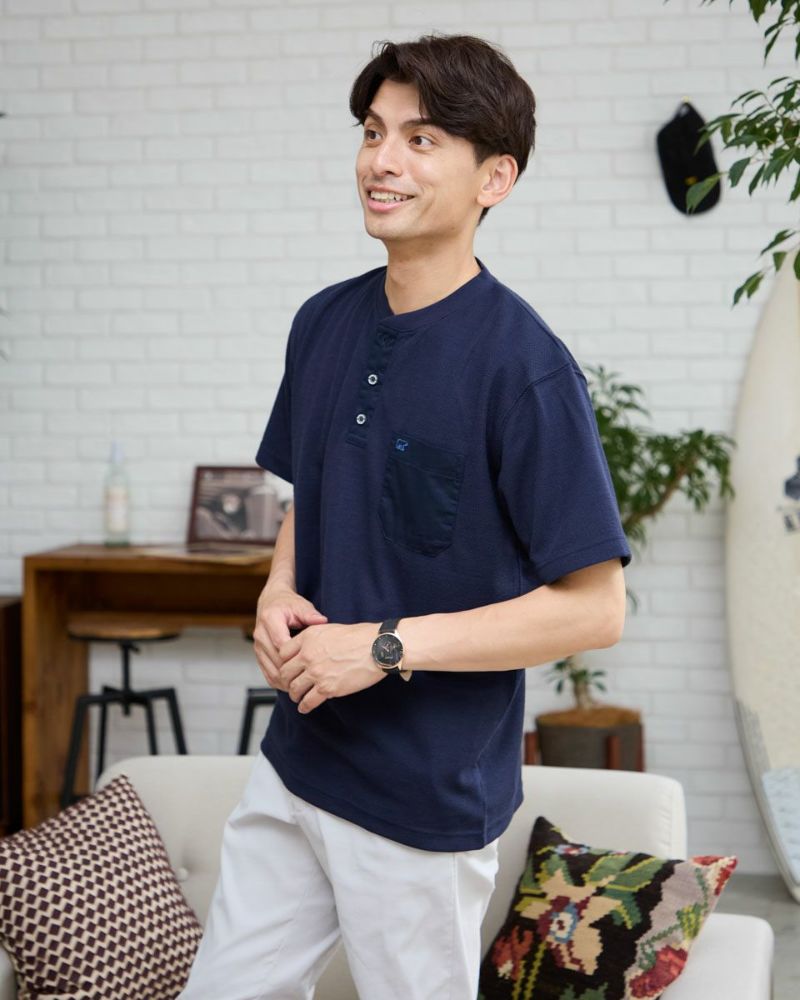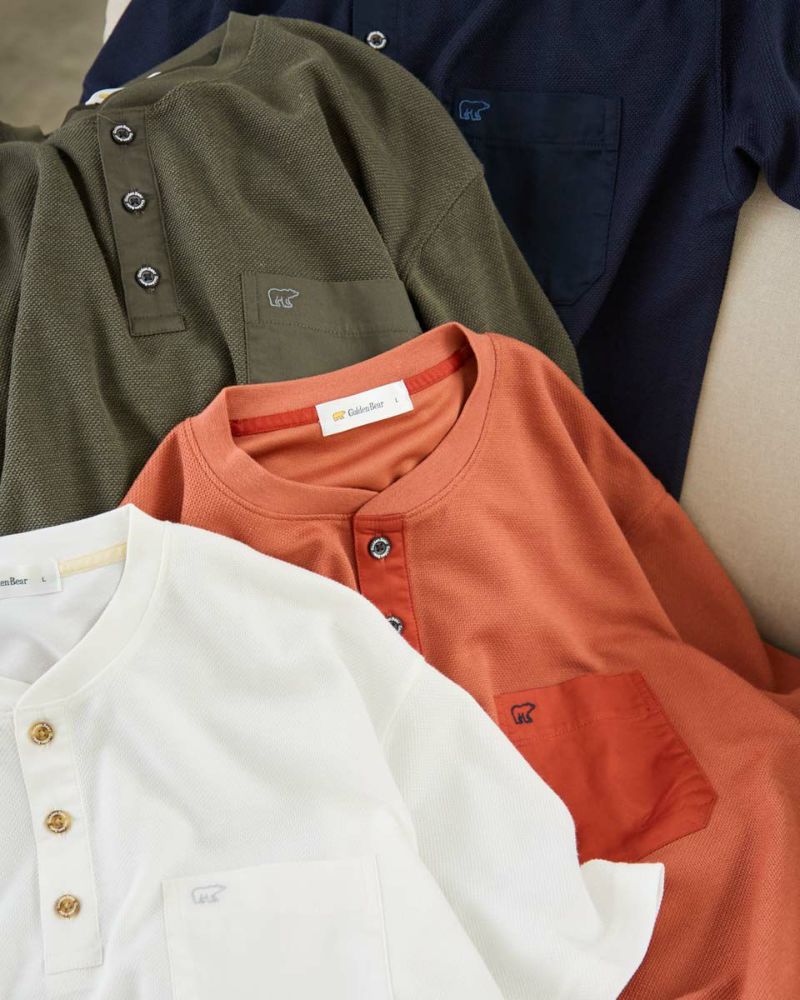 表情のあるワッフル鹿の子生地を使用したヘン リーネックTシャツです。前立てとポケット部分を身生地と同色の布帛で切り替えました。ライトアウターなどの羽織りアイテムのインナー使いとして重宝するTシャツです。 モデル身長: 180 cm 着用サイズ: L サイズ Golden Bear Men's カットソー (Men's) 【着用アイテム】314R4710 イージーパンツ 314R5701 スラックス