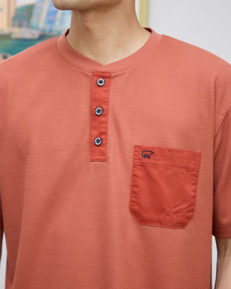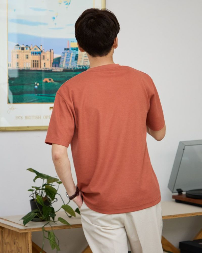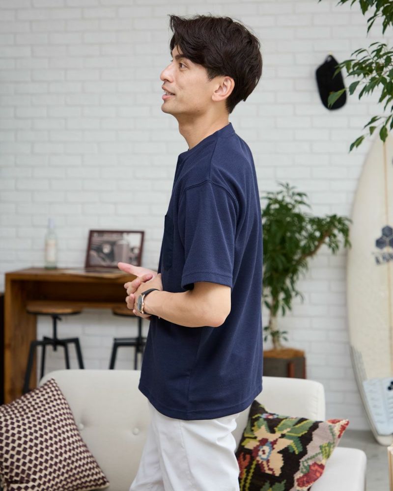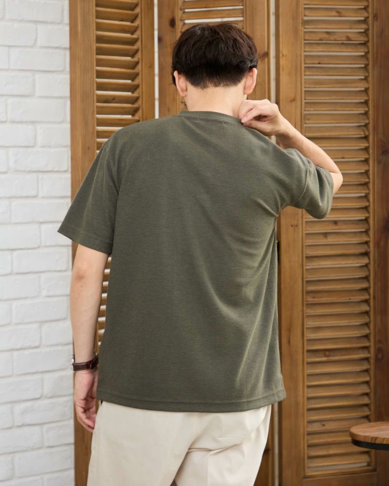 表情のあるワッフル鹿の子生地を使用したヘン リーネックTシャツです。前立てとポケット部分を身生地と同色の布帛で切り替えました。ライトアウターなどの羽織りアイテムのインナー使いとして重宝するTシャツです。 モデル身長: 180 cm 着用サイズ: L サイズ Golden Bear Men's カットソー (Men's) 【着用アイテム】314R4710 イージーパンツ 314R5701 スラックス