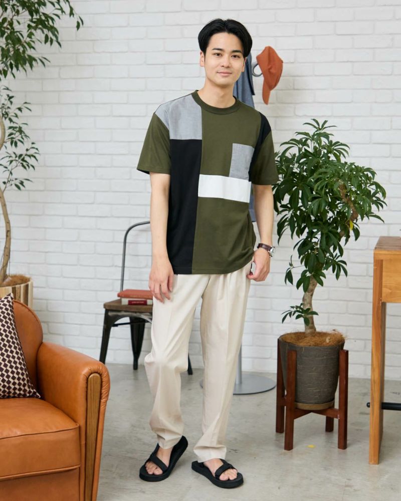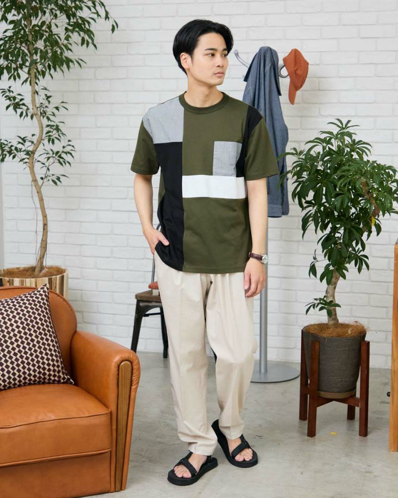 異なる生地で切り替えたクルーネックTシャツです。ダンガリー生地と色の異なる天竺で切り替えました。大胆な切り替えがコーディネートの主役になるTシャツです。 モデル身長: 176 cm 着用サイズ: L サイズ Golden Bear Men's カットソー (Men's) 【着用アイテム】314R3704 超ストレッチパンツ 314R5701 スラックス