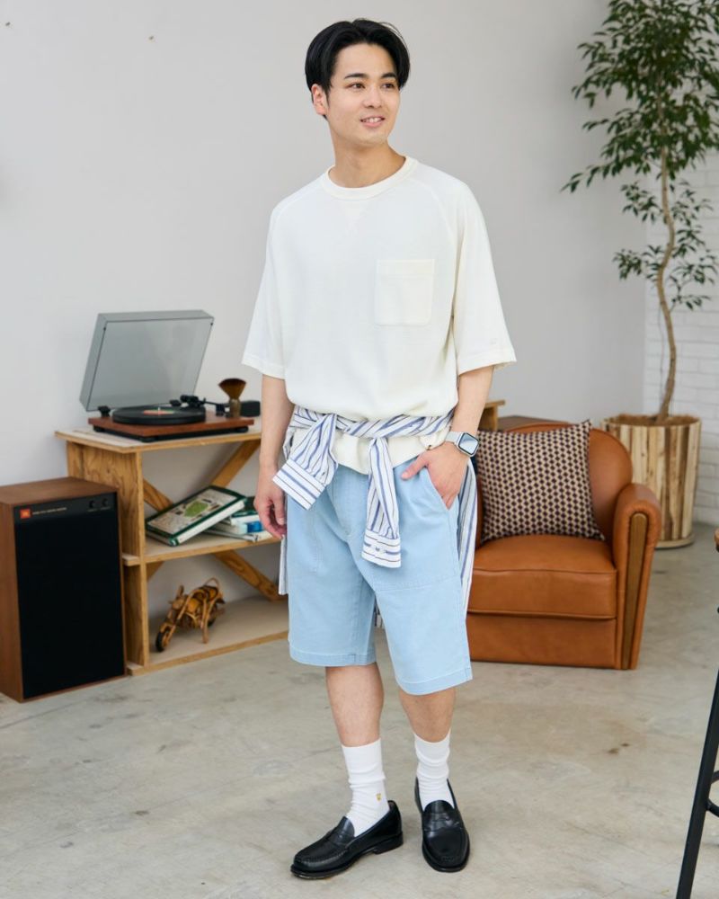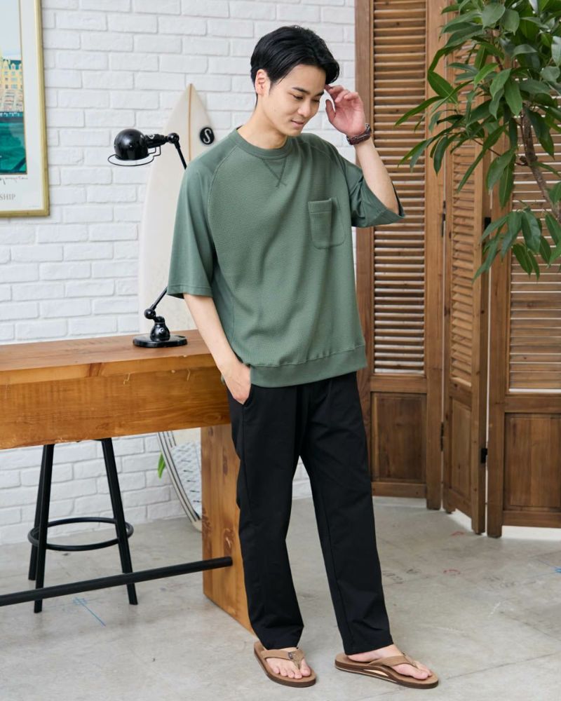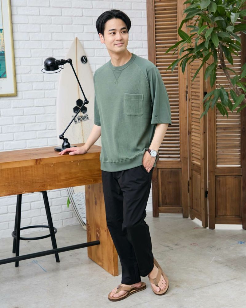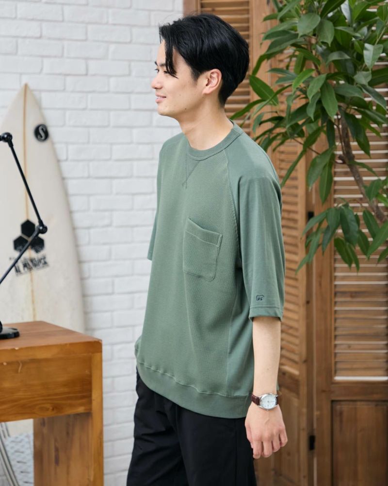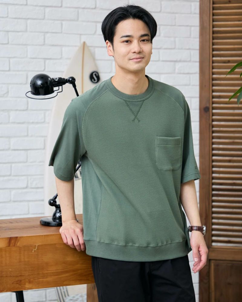 同色の異なる生地で切り替えたスウェットTシャツです。前身頃は表情のあるワッフル地、袖・後身頃は天竺生地を使用しています。サイズ感はややゆったりとしたリラックスシルエットです。 モデル身長: 176 cm 着用サイズ: L サイズ Golden Bear Men's カットソー (Men's) 【着用アイテム】314R4202 麻混ストライプシャツ 314R4710 イージーパンツ 314R6712 ベイカーパンツ