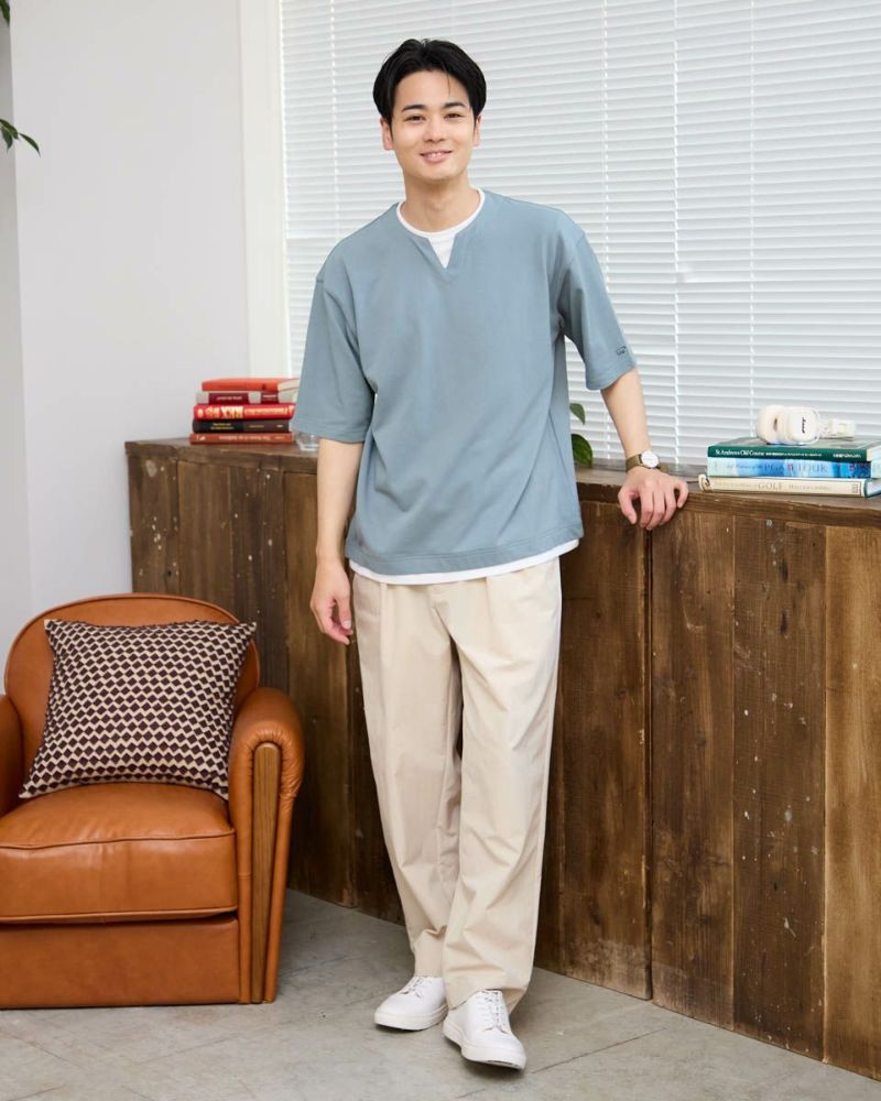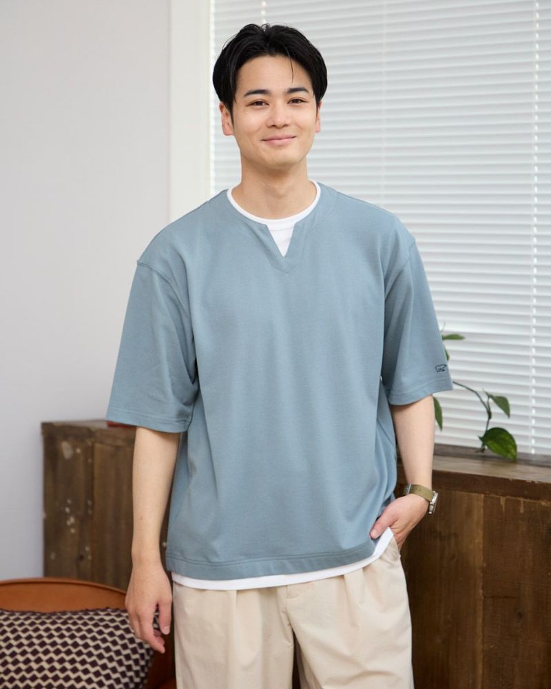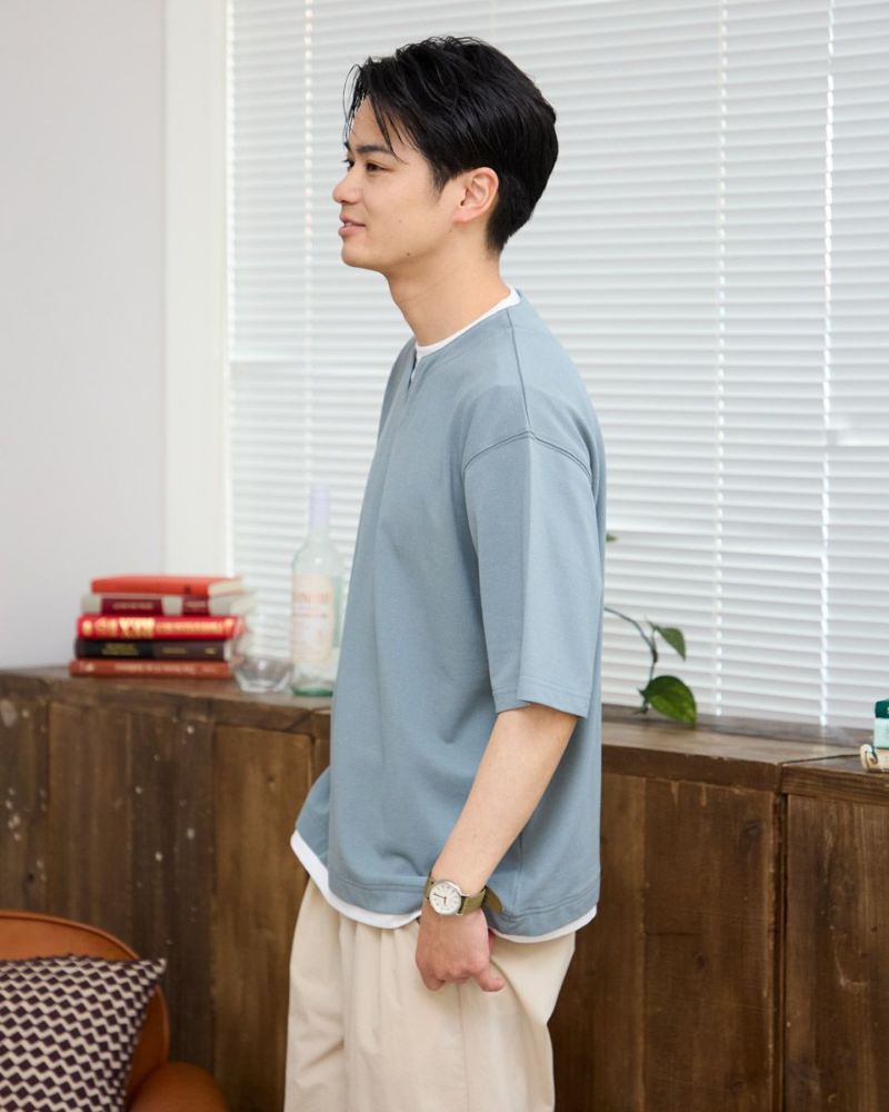 表情のある鹿の子素材を使用したレイヤードTシャツです。襟・裾から覗く天竺地が重ね着しているように演出します。ややゆったりとしたリラックスシルエットです。 モデル身長: 176 cm 着用サイズ: L サイズ Golden Bear Men's カットソー (Men's) 【着用アイテム】314R5701 スラックス 314R7701 カーゴハーフパンツ