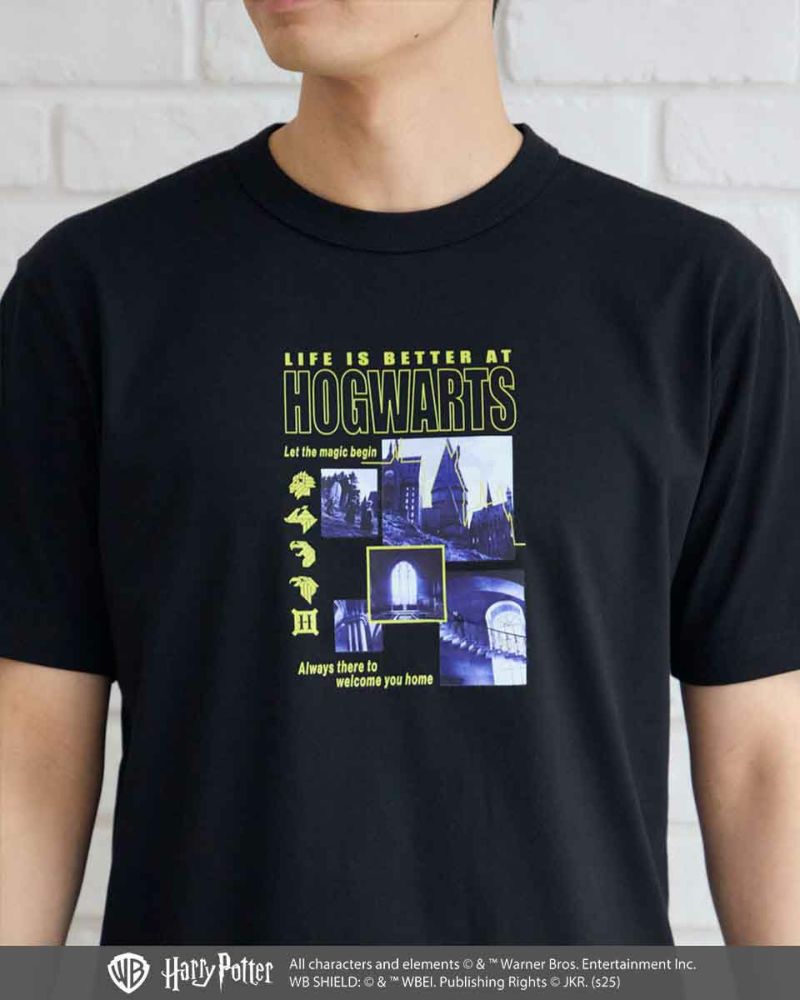 ブラックには、ホグワーツ城のシーンをモノトーンでプリント。ビビッドなイエローのテキストやロゴが効いたスタイリッシュなグラフィックに仕上げています。