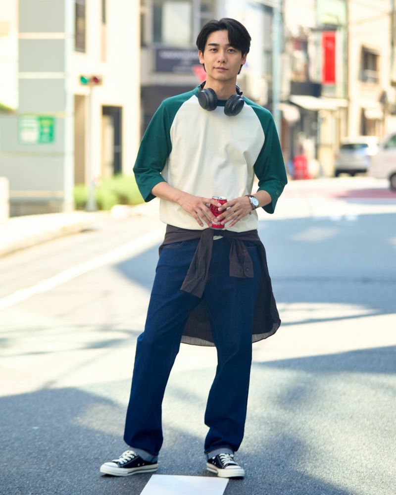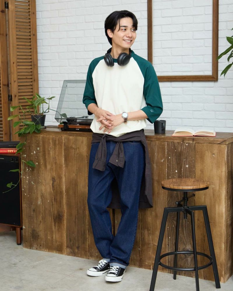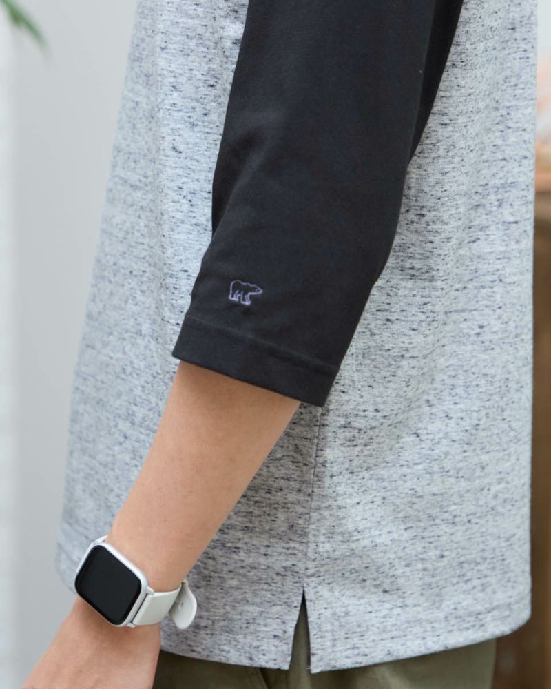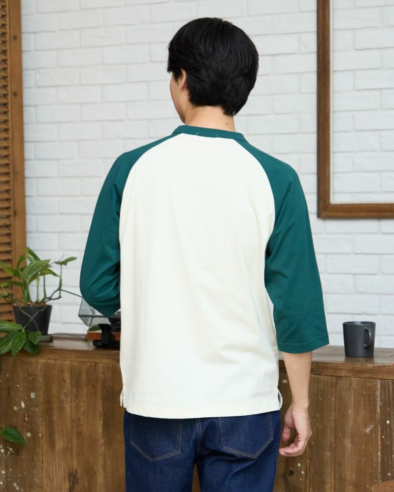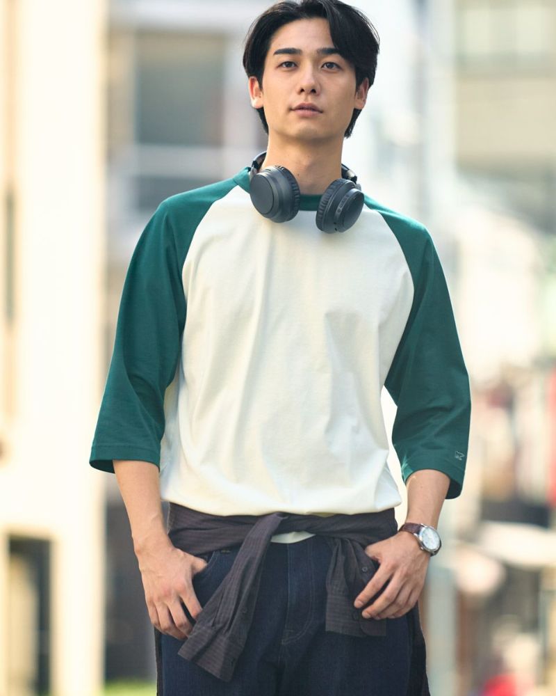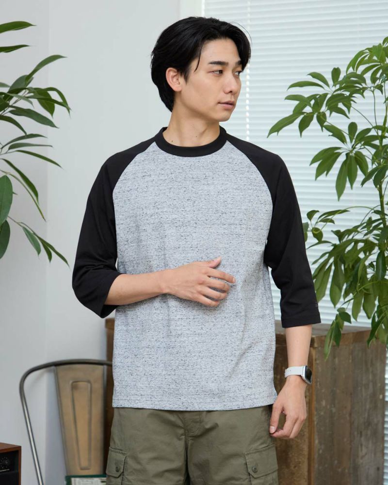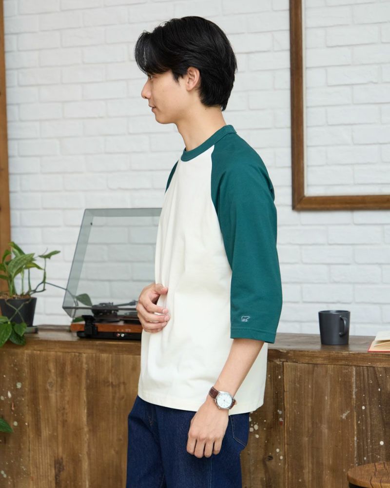 七分袖のベースボールTシャツです。滑らかな肌触りが特徴のプレーティング天竺を使用しています。ラグランスリーブ仕様のカラー切替がポイントです。 モデル身長: 180 cm 着用サイズ: L サイズ Golden Bear Men's カットソー (Men's) 【着用アイテム】314R7701 カーゴハーフパンツ 314R8212 バンドカラーシャツ 314R8702 デニム