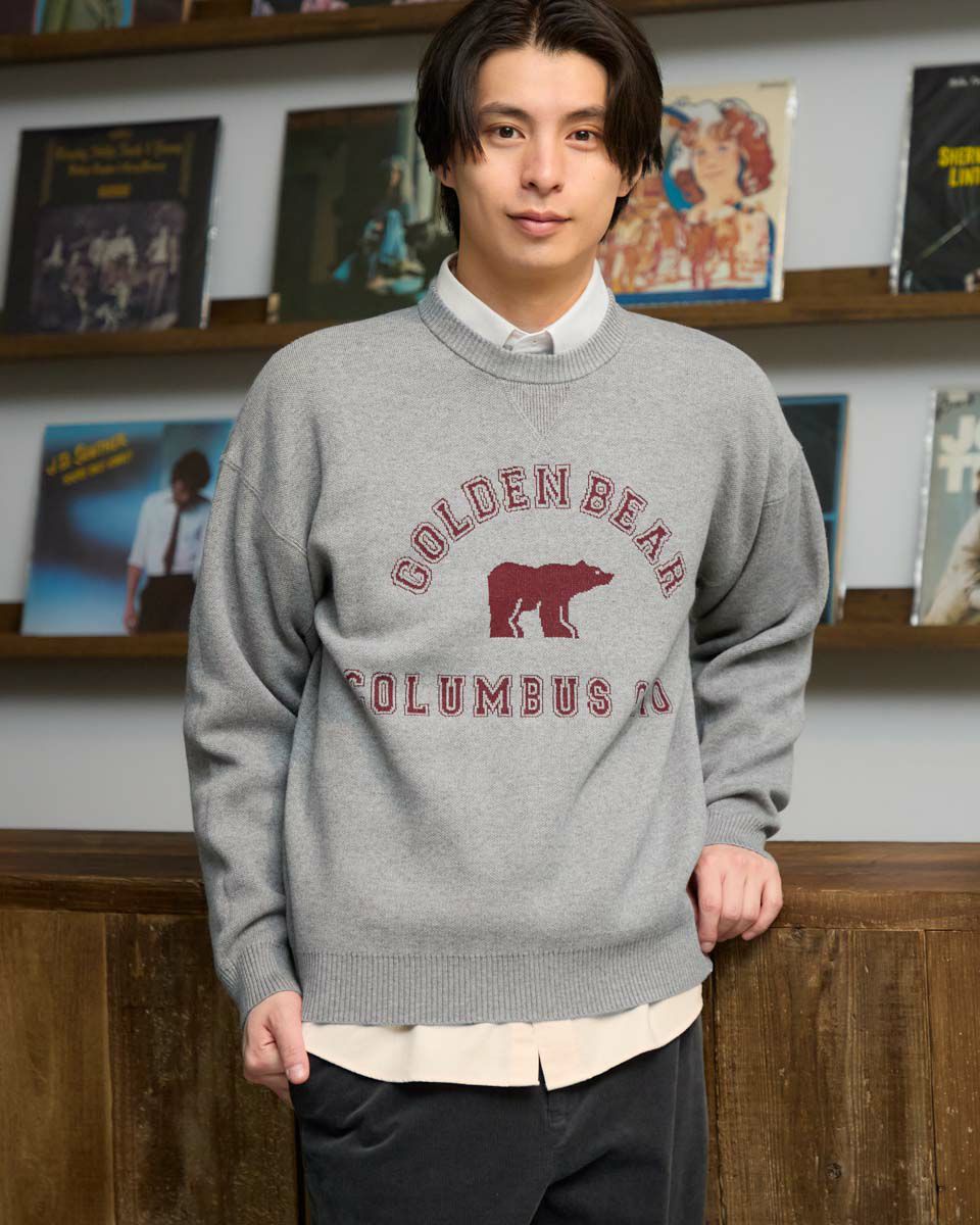 カレッジロゴスウェットをモチーフに、ロゴとアイコンのクマをニットで表現しました。王道のプレッピーコーデがおすすめです。ご家庭での手洗い洗濯が可能です。 モデル身長: 180 cm 着用サイズ: L サイズ Golden Bear MEN ニット (MEN) ウィメンズサイズはこちら 家族コーディネートアイテムはこちら 【着用アイテム】314RC230 オックスシャツ 314RE721 ストレッチコーデュロイパンツ