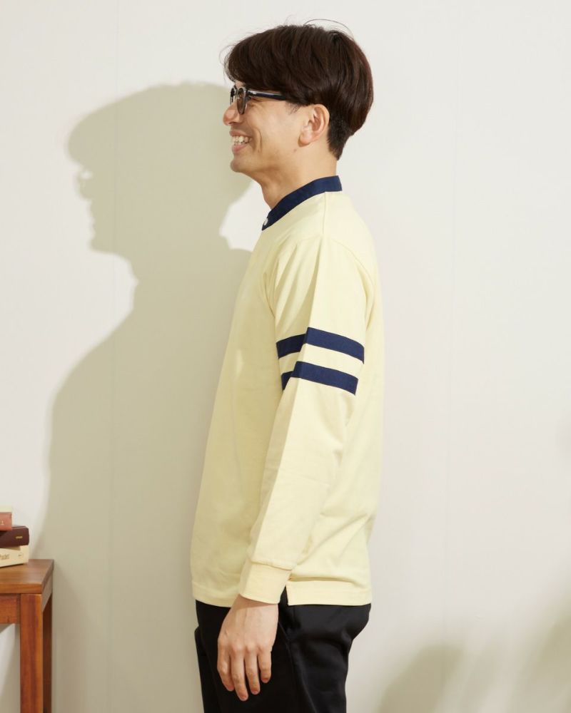 バンドカラーのラガーシャツです。強度のある杉綾テープの比翼前立、開閉のしやすいラバーボタンなど細部まで拘り本格的に仕上げました。リラックス感のあるゆったりとしたシルエットです。ロゴ刺繍や左袖のラインがのアクセントになる1枚です。