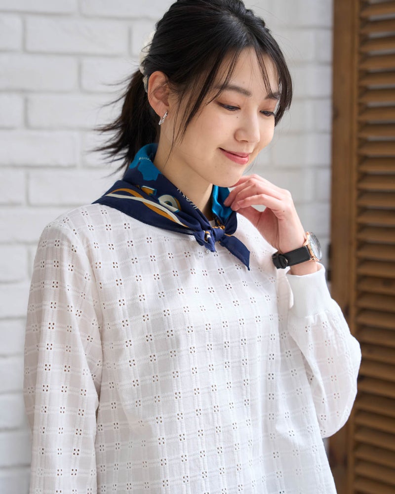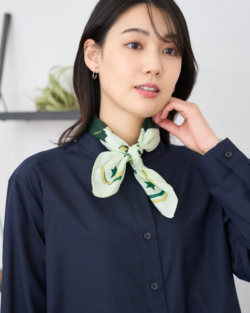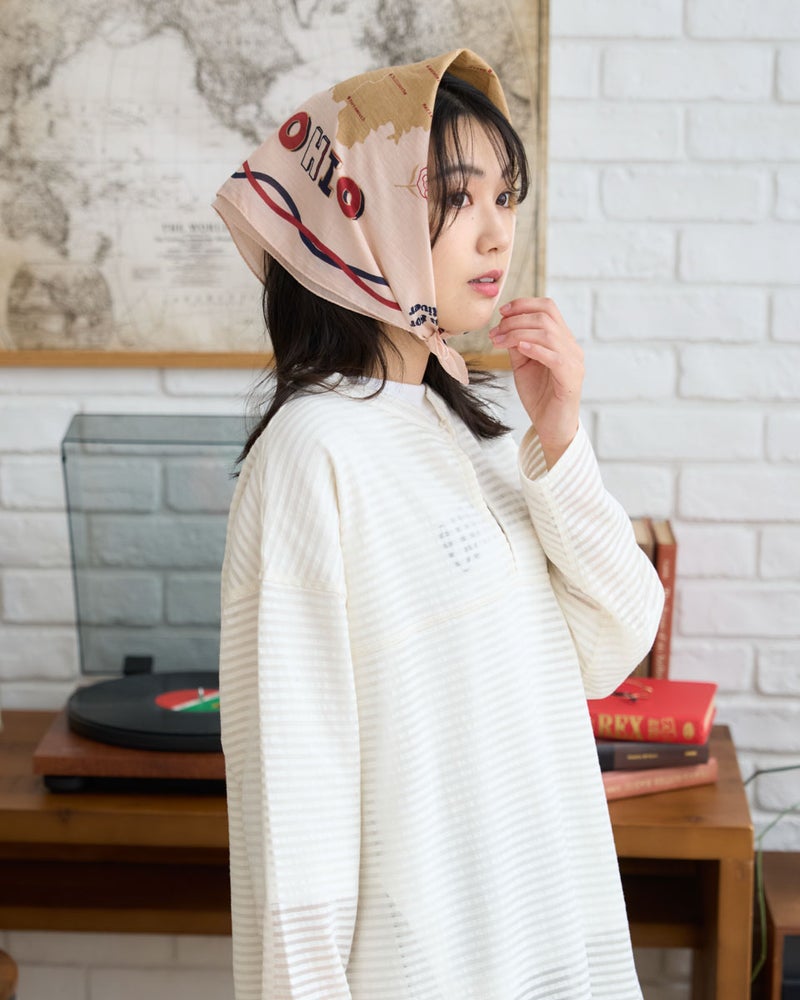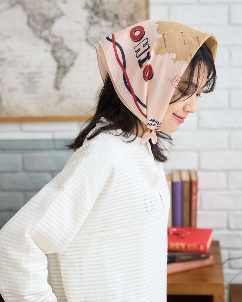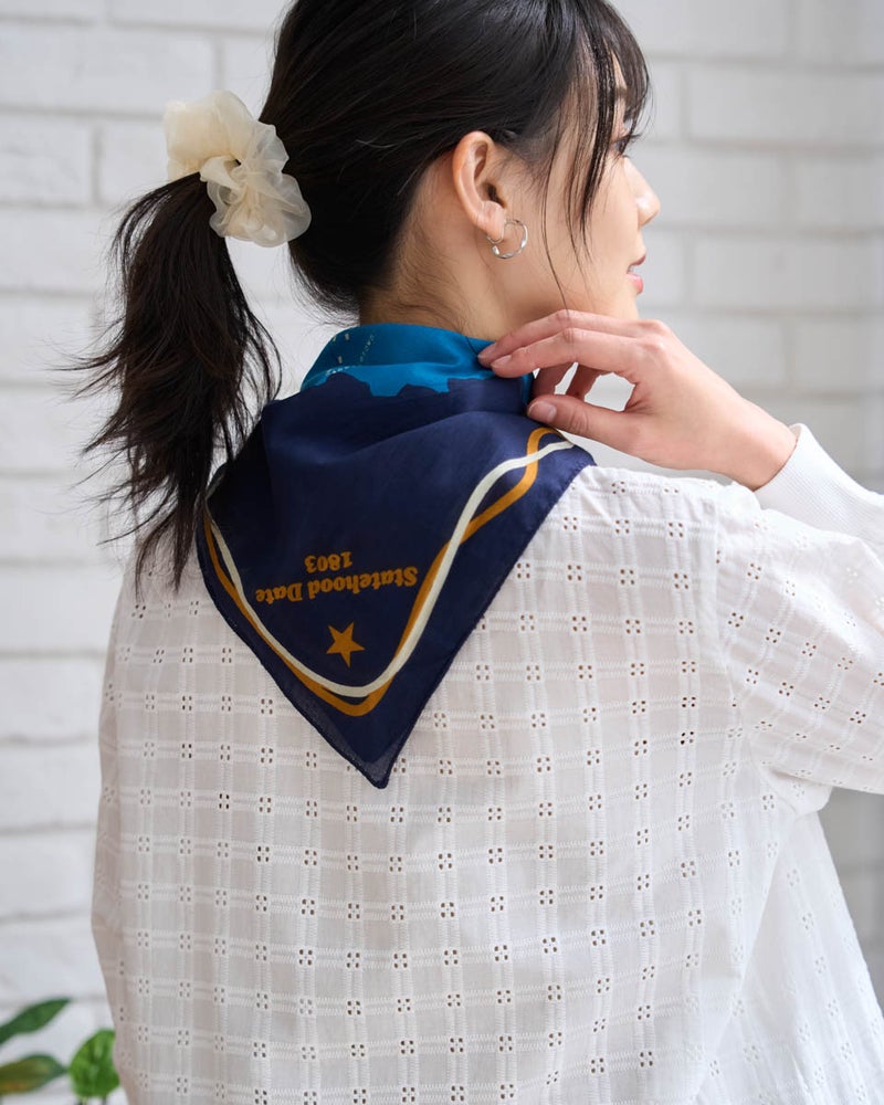 オハイオ州を描いたオリジナルバンダナ。肌に優しいインド製オーガニックコットン100%のソフトな風合いにこだわりました。ノスタルジックな雰囲気のプリントが特徴で首元のアクセントやハンカチとしてワクワクを添える一枚です。 Golden Bear WOMEN アクセサリ (WOMEN) 【着用アイテム】467U3310 オーガニックコットンレースブラウス 467U3313 ドロストシャツ 467U3413 ネットカットソー