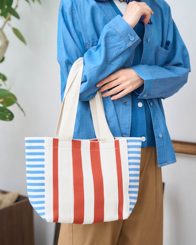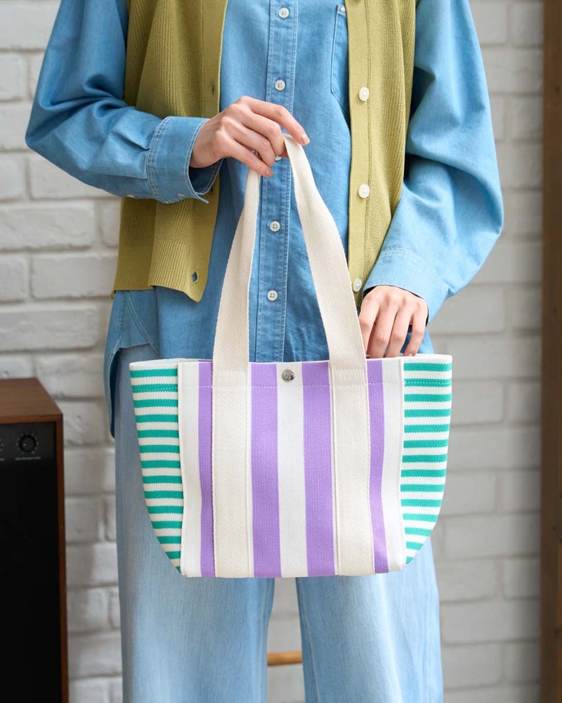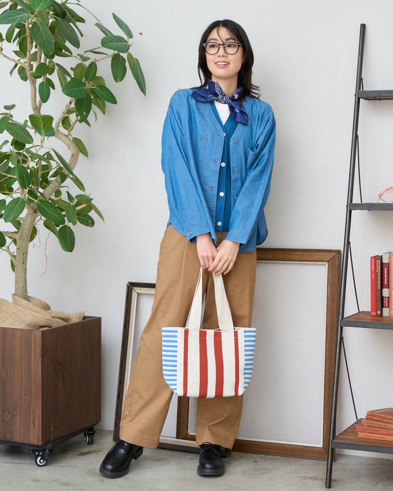 柔らかなニット素材でストライプ柄が印象的なトートバッグです。いつものコーディネートに彩りと個性をプラスしてくれます。 Golden Bear WOMEN アクセサリ (WOMEN) 【着用アイテム】467U4306 オーガニックコットンデニムシャツ 467U4430 オーガニックコットンTシャツ 467U4601 畦編みベスト 468U4750 ワイドデニムパンツ