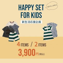\新生活・新学期を応援!/ 新生活・新学期に向けて、通園・通学に活躍するキッズアイテムのハッピーセットをご用意しました。 Tシャツ3点+パンツ1点の4点タイプと...